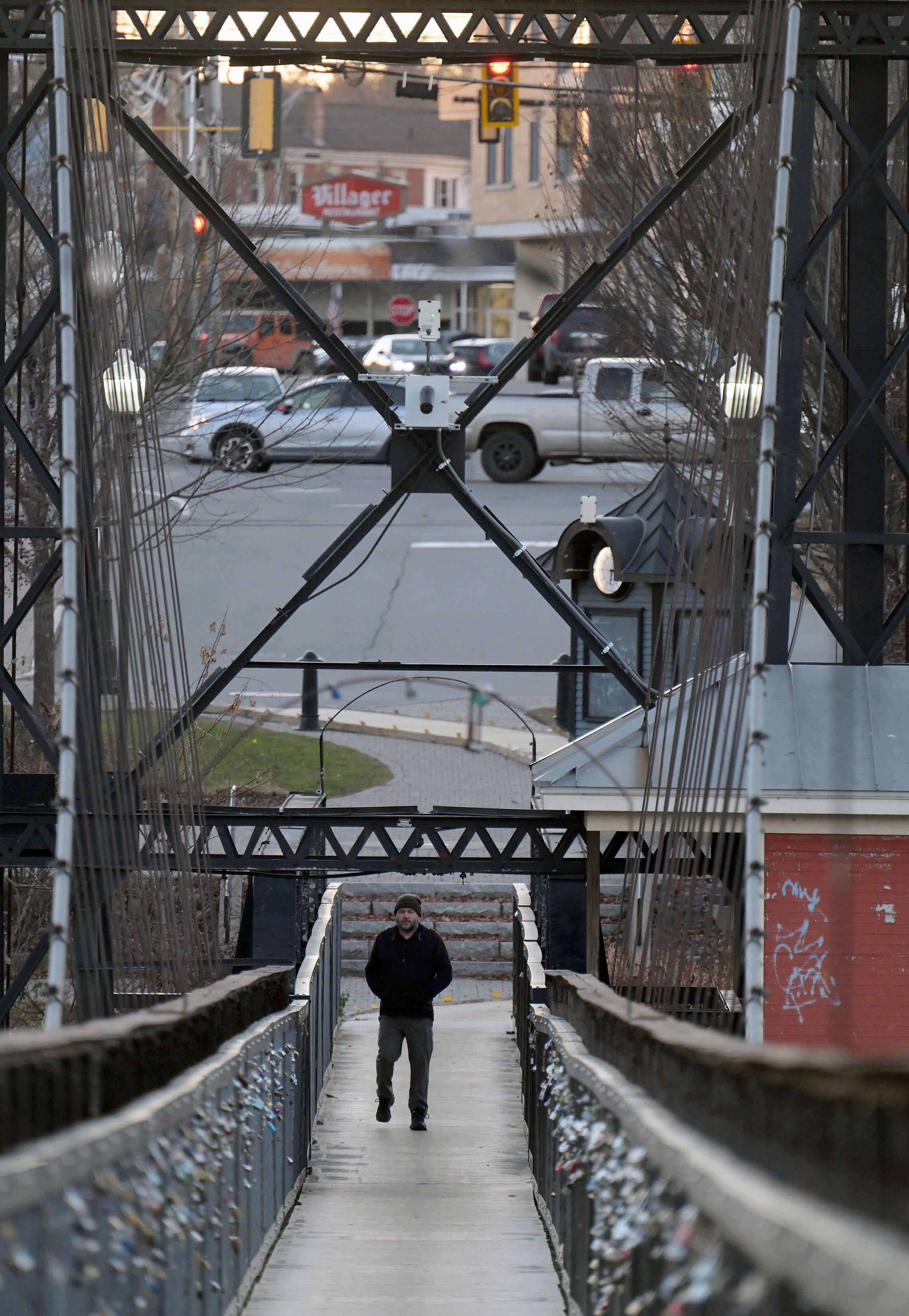 Downtown traffic, as seen Wednesday from Winslow, passes above a walker who crosses the Two Cent Bridge over the Kennebec River connecting Winslow and Waterville. (Rich Abrahamson/Staff Photographer)