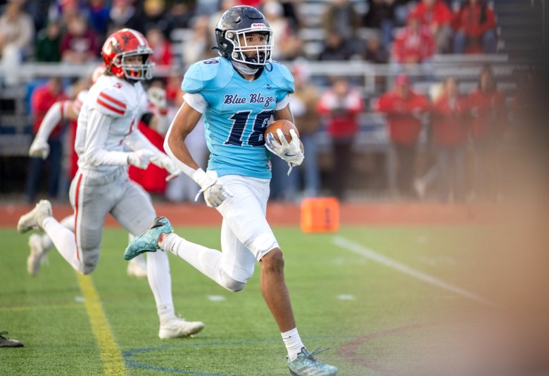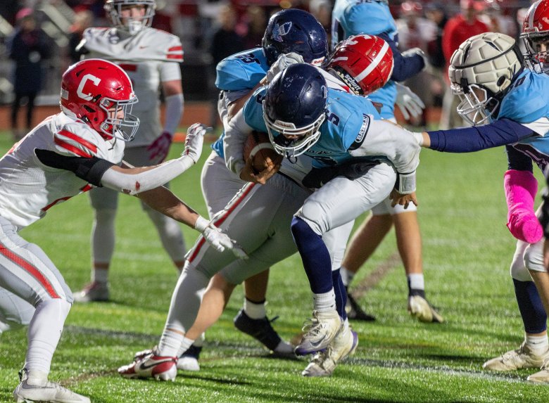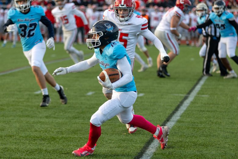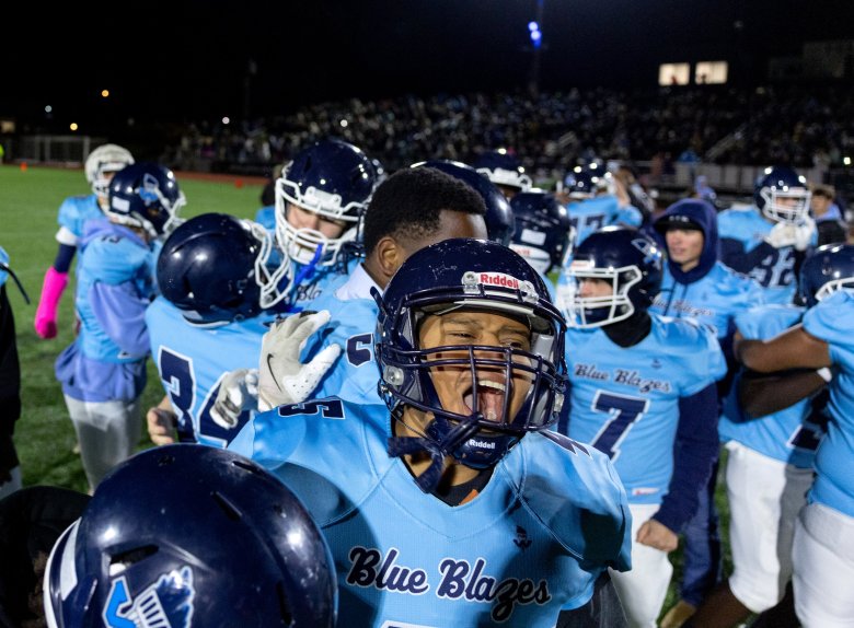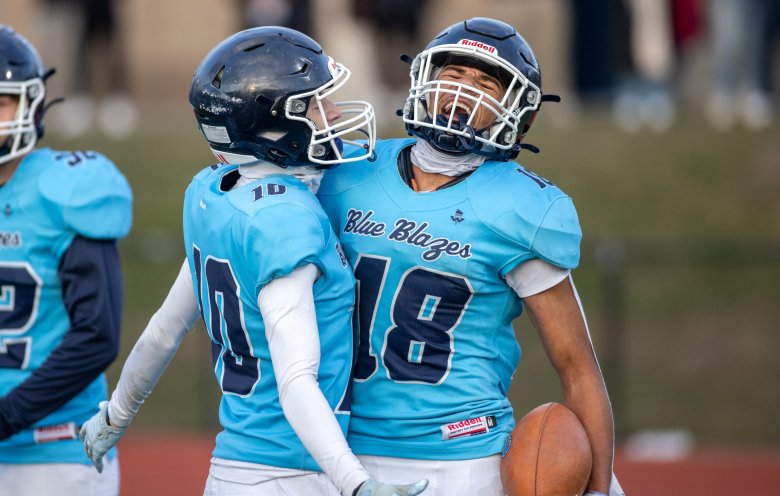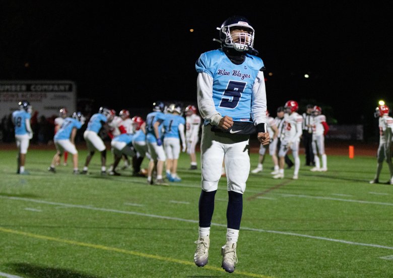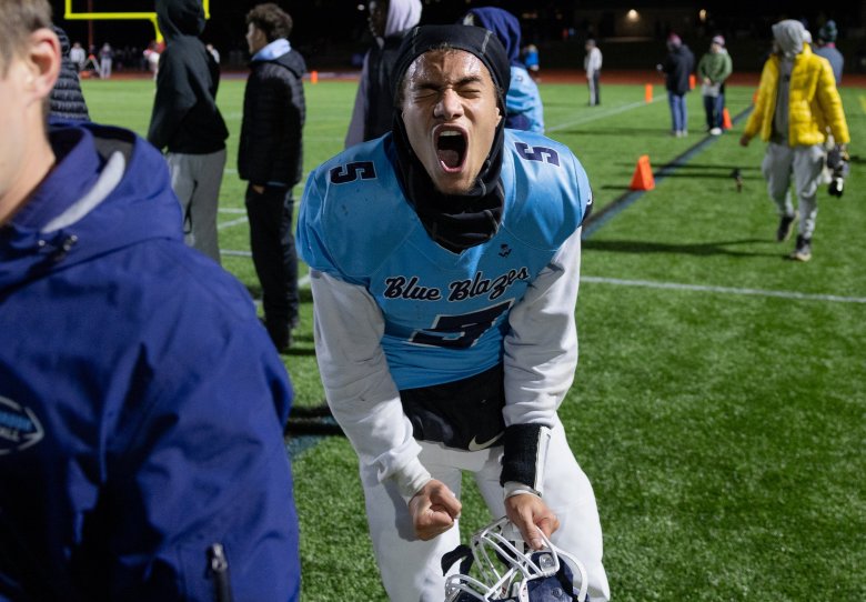 Cony was stymied by the Blue Blazes’ remarkable athleticism, from Staples to Bongomin to Lubin. Coach B.L. Lippert called Bongomin, who made a great play to stuff the Rams’ David Frye on a fake punt early in the third quarter in addition to his pick-six, the best football player in the state and possibly the best linebacker he’s ever coached against.