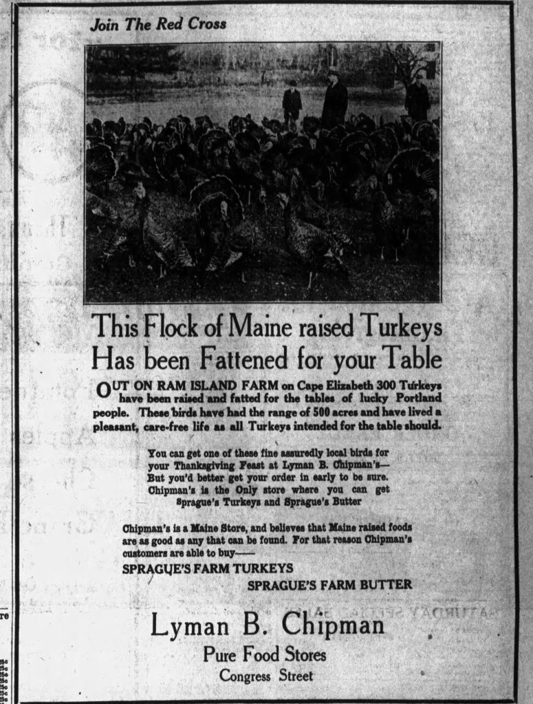 “Out on Ram Island Farm in Cape Elizabeth 300 Turkeys have been raised and fatted for the tables of lucky Portland people. These birds have had the range of 500 acres and have lived a pleasant, care-free life as all Turkeys intended for the table should,” read an ad published on Nov. 20 in the Evening Express under the headline “This Flock of Maine raised Turkeys Has been Fattened for your Table.”