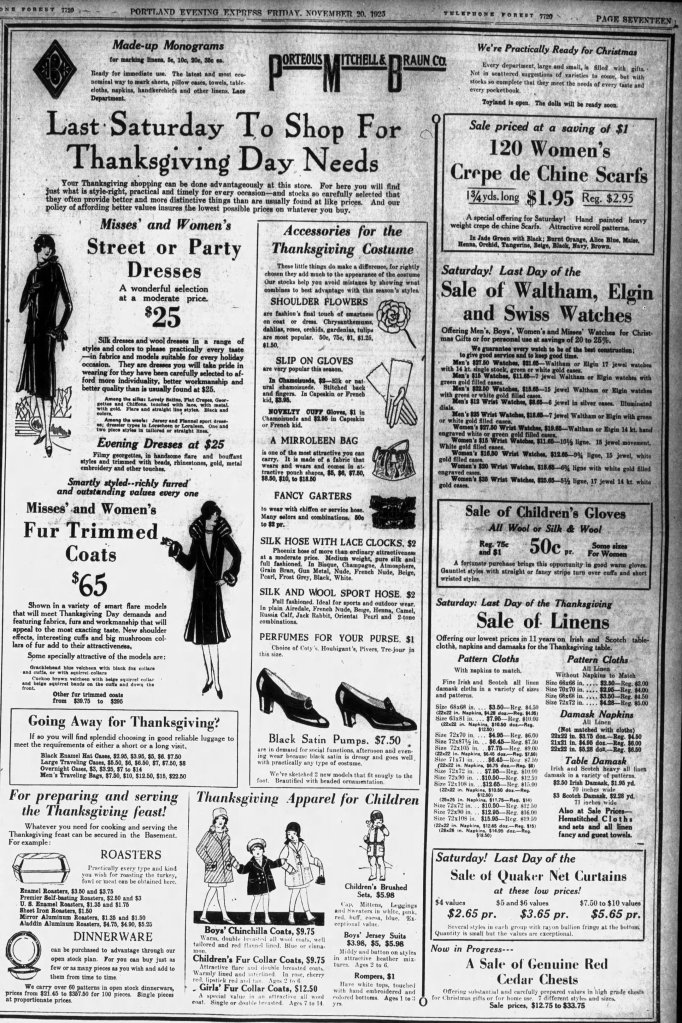 At Porteous Mitchell & Braun Co. in Portland, there was a “wonderful” selection of street and party dresses on sale for $25, according to an ad published in the Portland Evening Express on Nov. 20, 1925. Fur trimmed coats were $65, and fancy garters started at 50 cents.