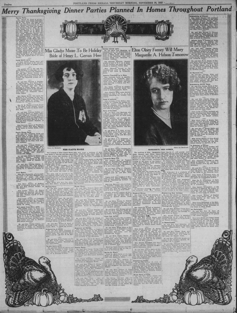 On Thanksgiving morning, the Press Herald dedicated a full page, rimmed with ornate illustrations of turkeys, to the social plans of Portland residents. Many had family or friends visiting from out of state.
