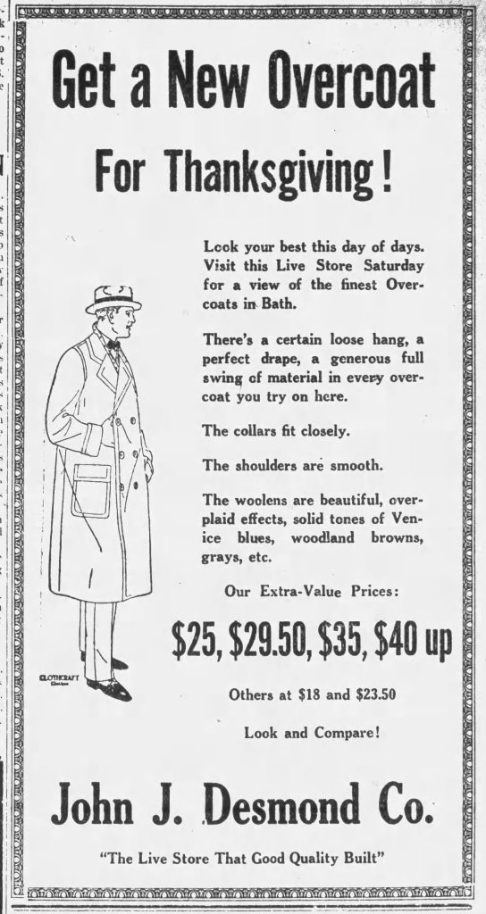 The John J. Desmond Co. in Bath encouraged men to get a new overcoat for Thanksgiving. “Look your best this day of days,” read an ad published in The Times Record. The “extra-value” prices started at $25.