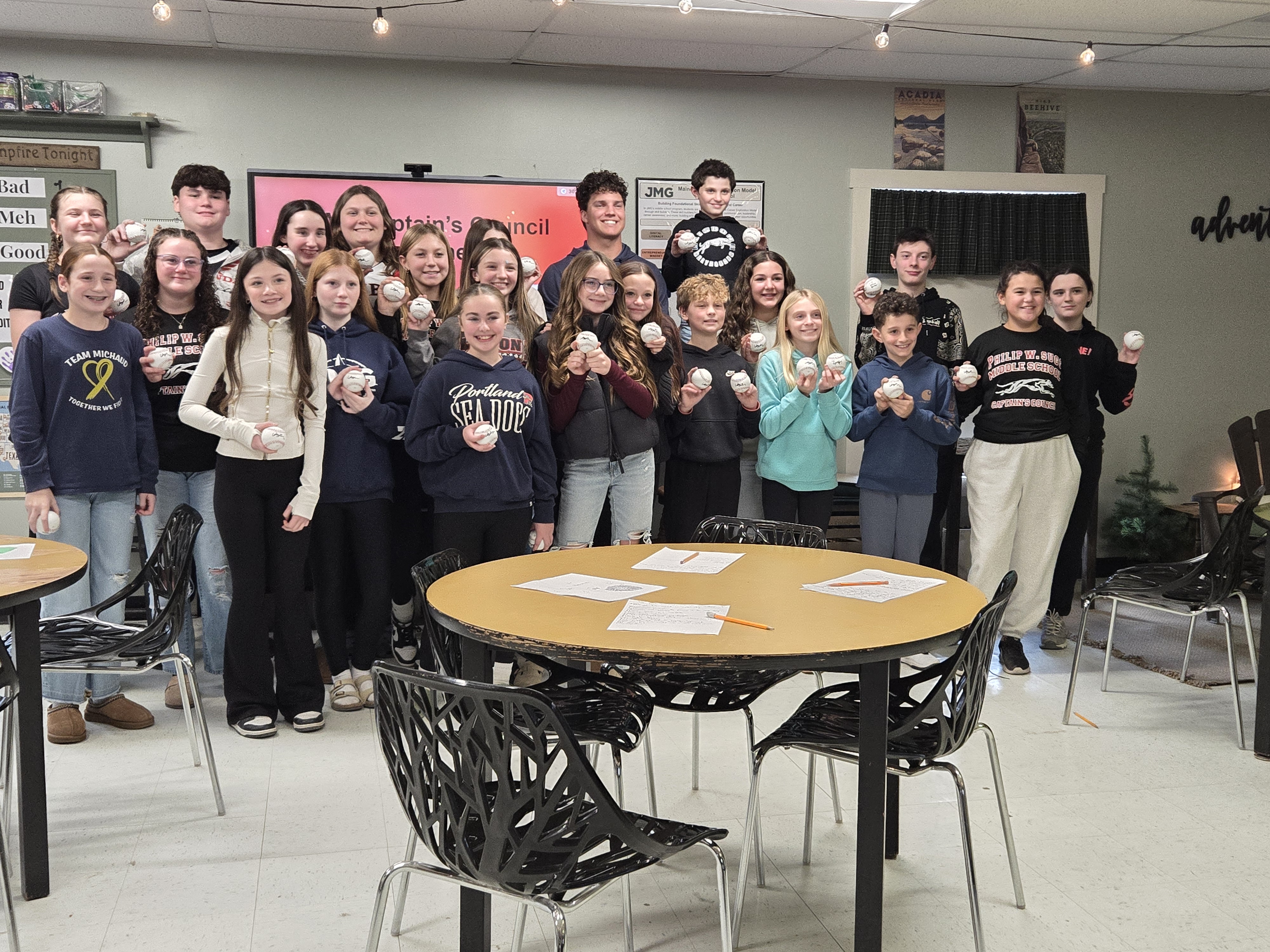 Students on the Philip W. Sugg Middle School Captain Council pose with baseballs Monday afternoon for a photo with recently drafted Philadelphia Phillies pitcher Cody Bowker, back row, second from right. (Kendra Caruso/Staff Writer)