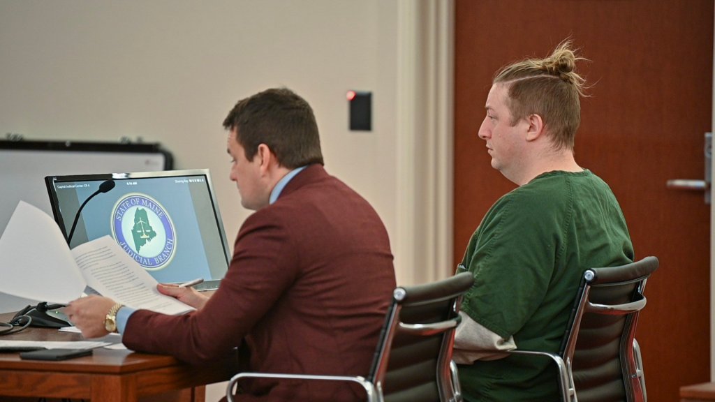 Defense attorney Daniel Dube, left, and defendant Christopher Connors sit in the court room Tuesday during sentencing at the Capital Judicial Center in Augusta. (Joe Phelan/Staff Photographer)