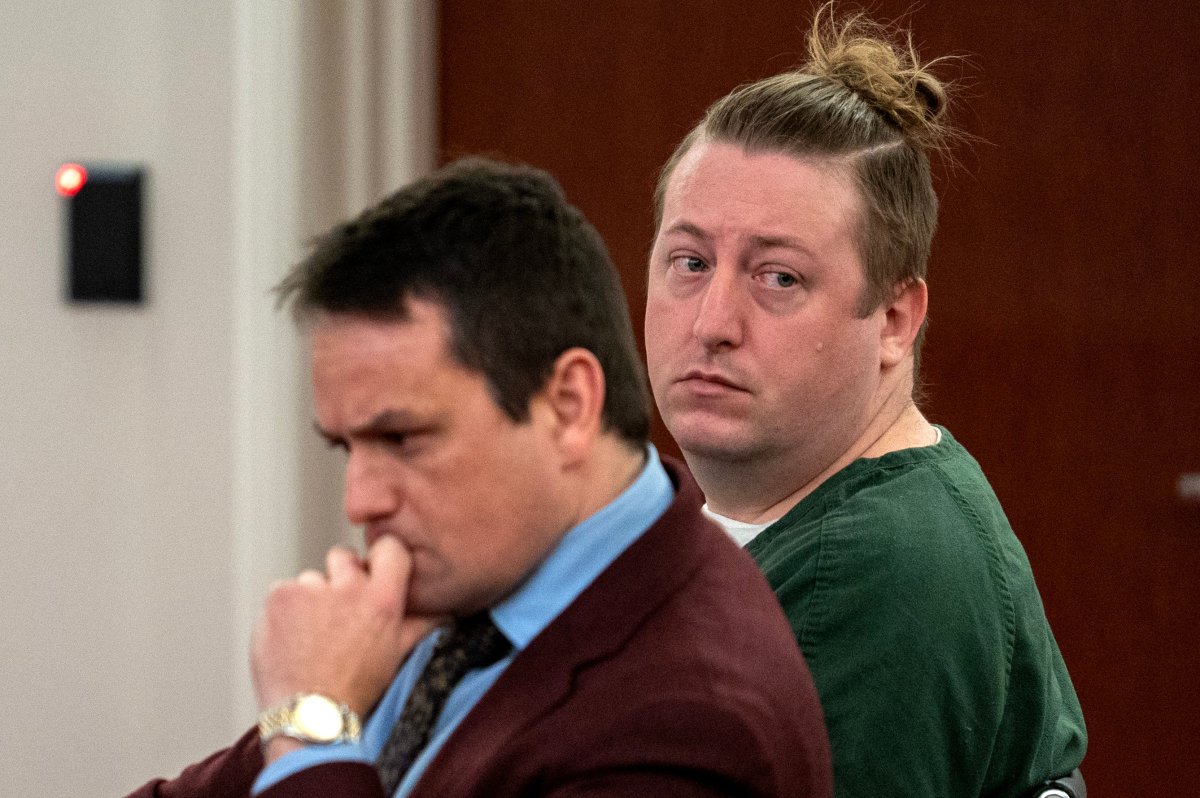 Defense attorney Daniel Dube, left, and defendant Christopher Connors listen to victim impact statements Tuesday during sentencing at the Capital Judicial Center in Augusta. (Joe Phelan/Staff Photographer)