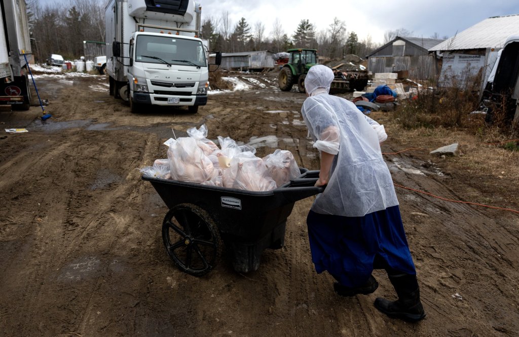 NEW SHARON — Tim Henderson carefully weighed the fresh turkey, tucked it into a clear plastic bag and used a marker to write down its weight on a tag.