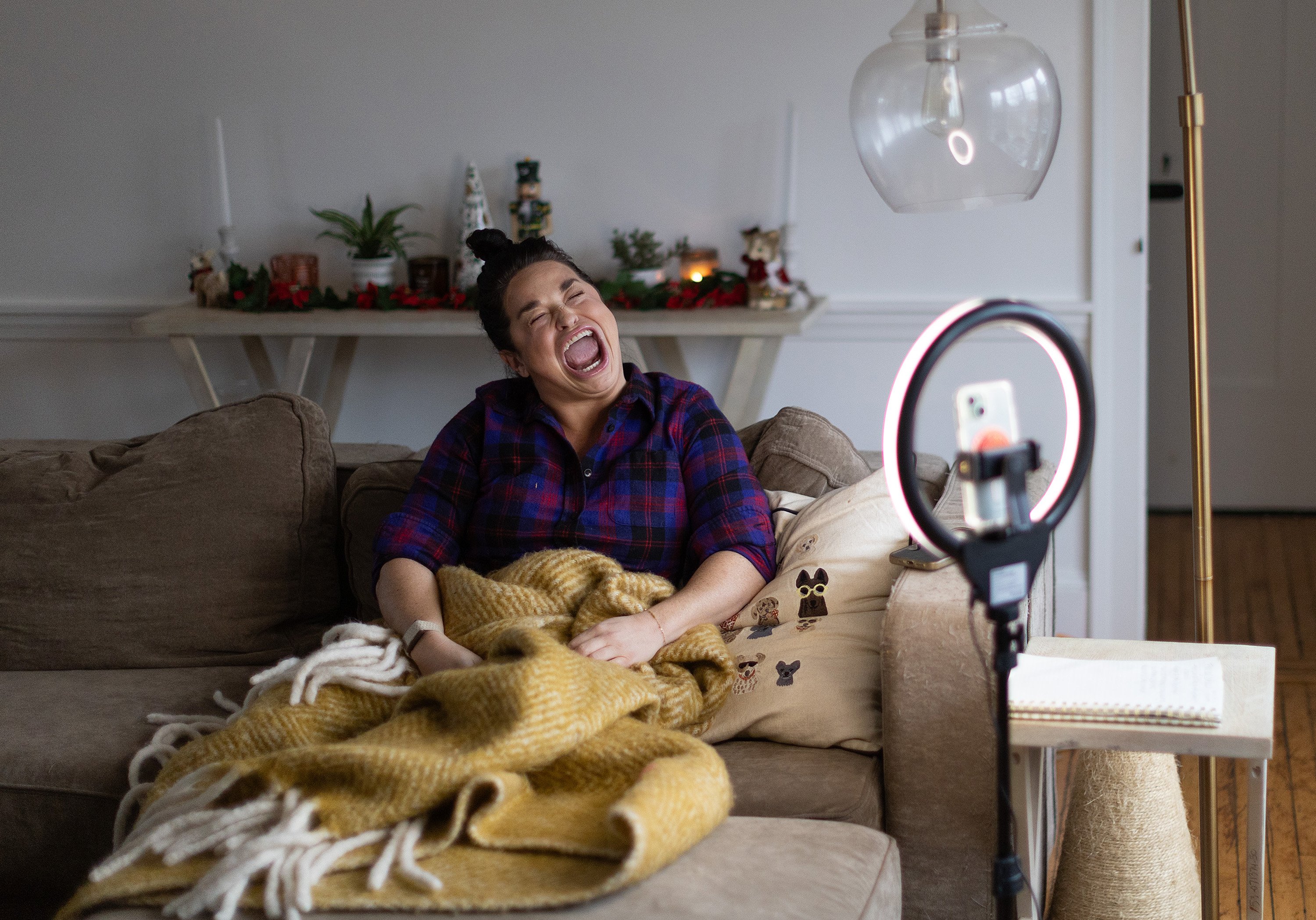 FALMOUTH — In a full face of makeup, a flannel shirt, pajama pants and slippers, Sam Ramsdell sits in the corner of her couch with a blanket on her lap and a camera pointed toward her — a setup not so different from that of many remote workers, except she’s not on a Zoom call.
