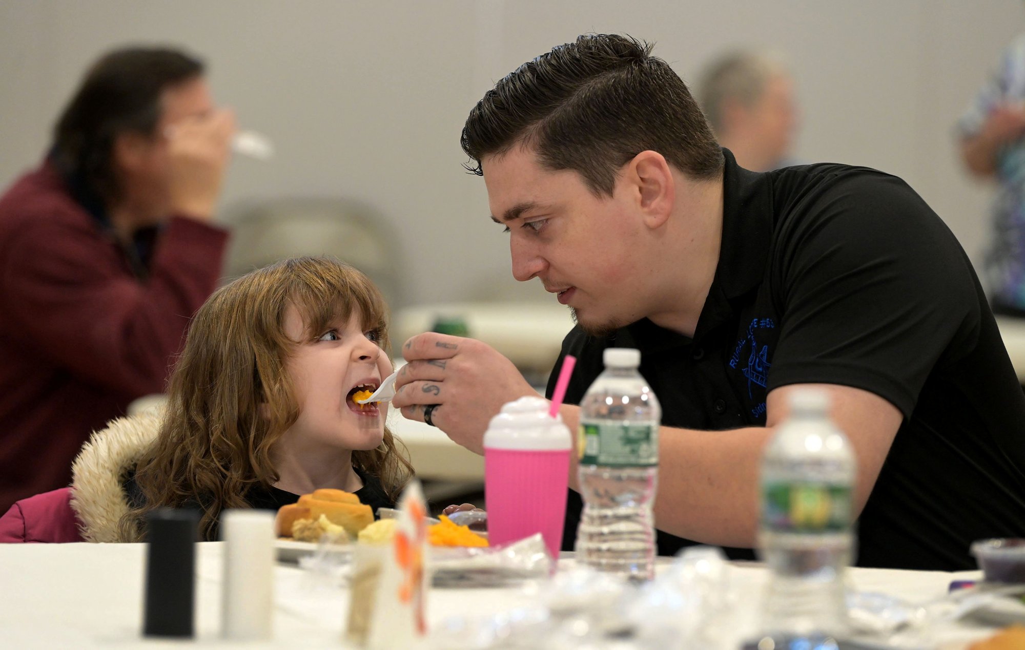 Aurora Centeio, left, tries squash Thursday while sharing with her dad, Hunter Centeio of Augusta, during the Scottish Rite of Augusta Valley and Hermon Lodge No. 32 free Thanksgiving meal at the Boys and Girls Club of Kennebec Valley in Gardiner. (Rich Abrahamson/Staff Photographer)
