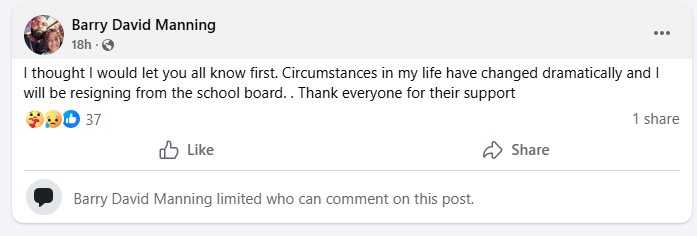 “Circumstances in my life have changed dramatically and I will be resigning from the school board,” Manning wrote on Monday afternoon after the video was posted.