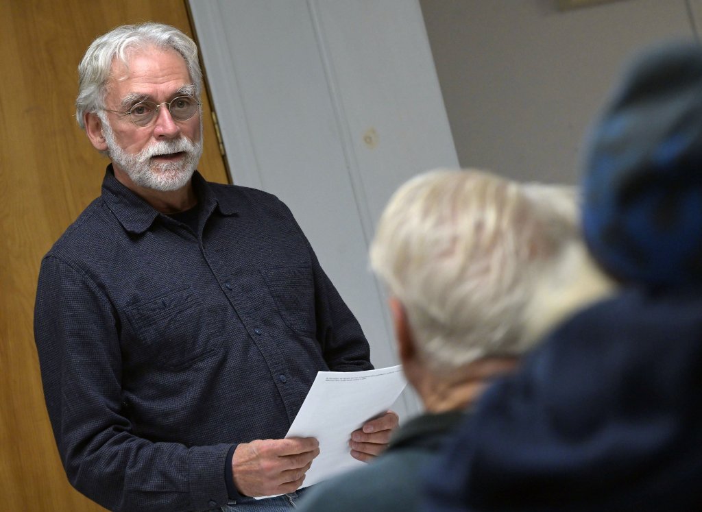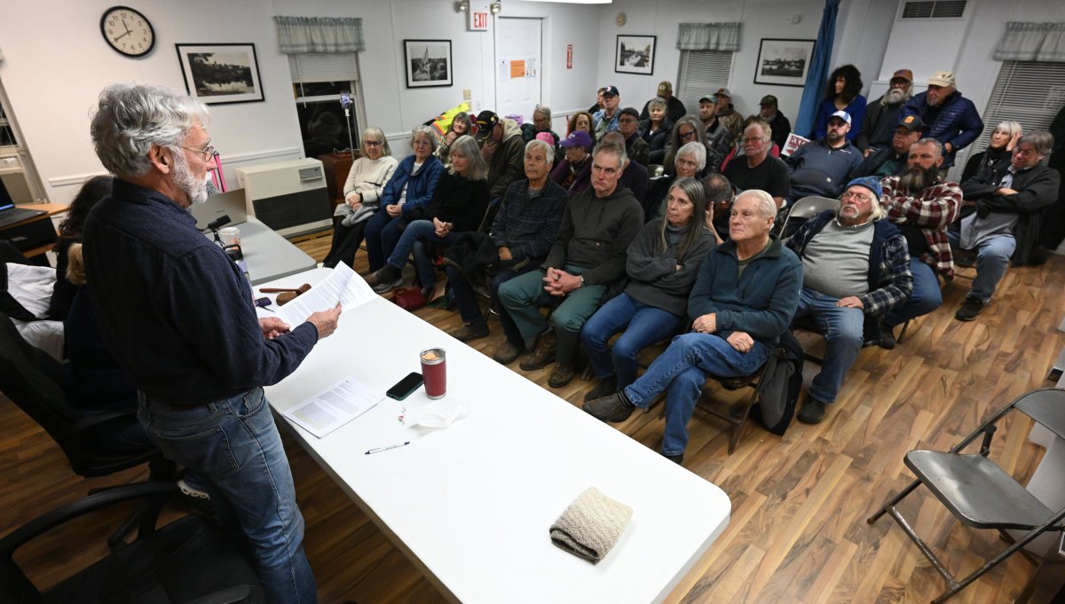 Rene Ouellet, left, speaks during a public hearing for his recall at the Freedom Town Office in Freedom, Maine on Nov. 20. About 50 people attended the hearing. (Rich Abrahamson/Staff Photographer)