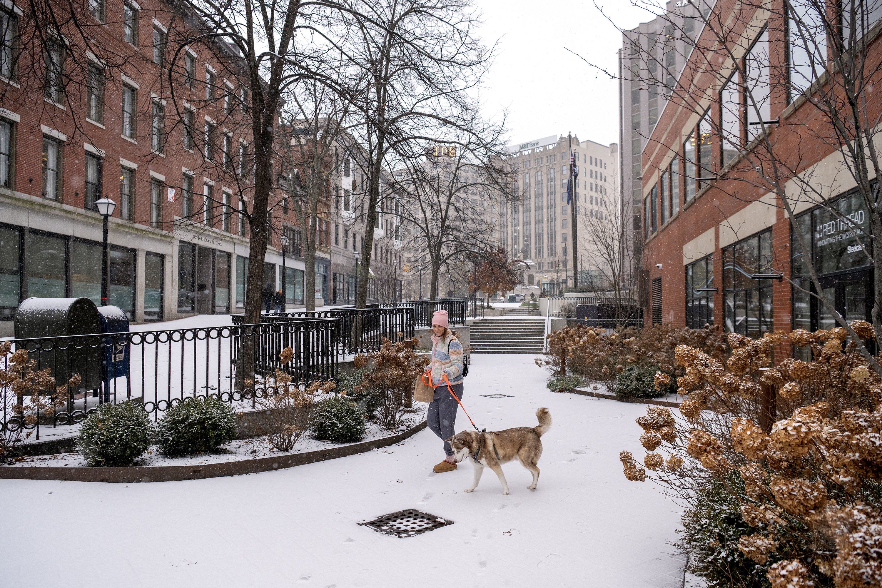Elsewhere in Lewiston, Kaitlyn Curtis strolled down Cedar Street, following as her emotional support dog, Moth, left paw prints in the powder. The dog wore pink booties “to keep him warm and the salt out of his paws,” she said.