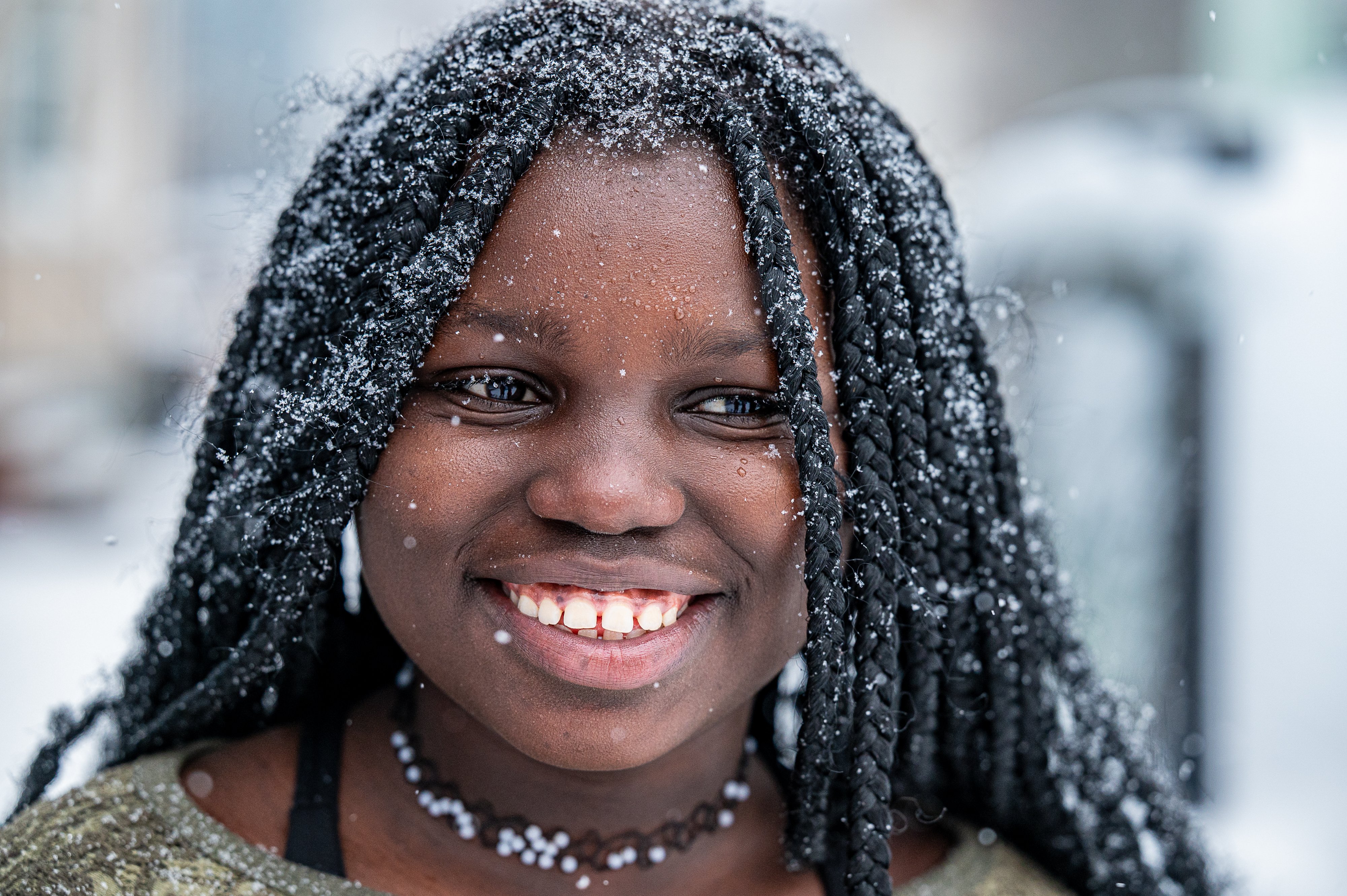 Joli Gembize, a recent immigrant from Rwanda, walked with members of her family Tuesday morning. Snowflakes landed in her braided hair.