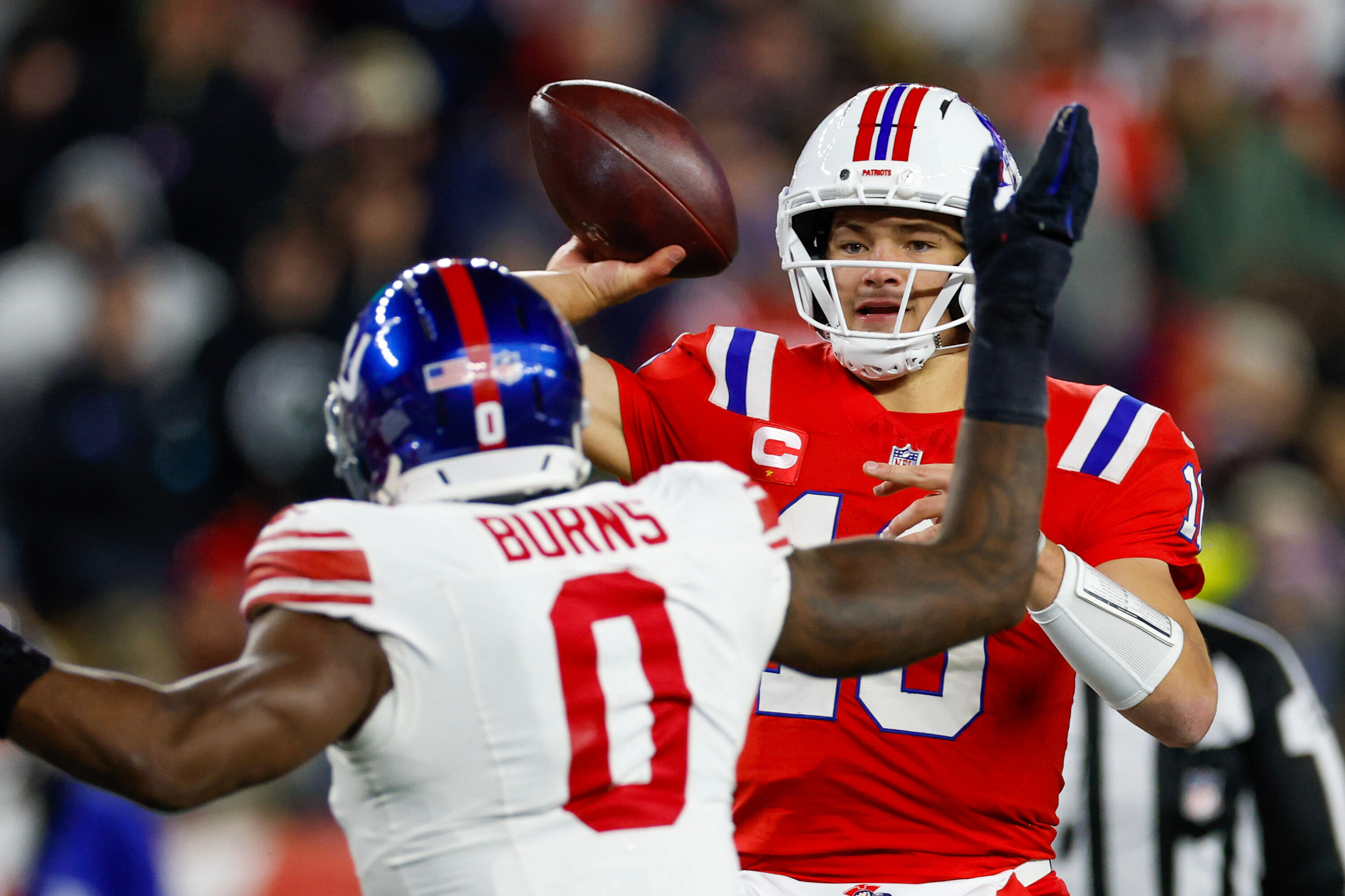 Safety Jaylinn Hawkins was whistled for a 15-yard unnecessary roughness penalty in the second quarter for his helmet-to-helmet hit on Giants tight end Theo Johnson. It set New York up on the Patriots 30, and Jaxson Dart threw a touchdown pass to Darius Slayton on the ensuing play.