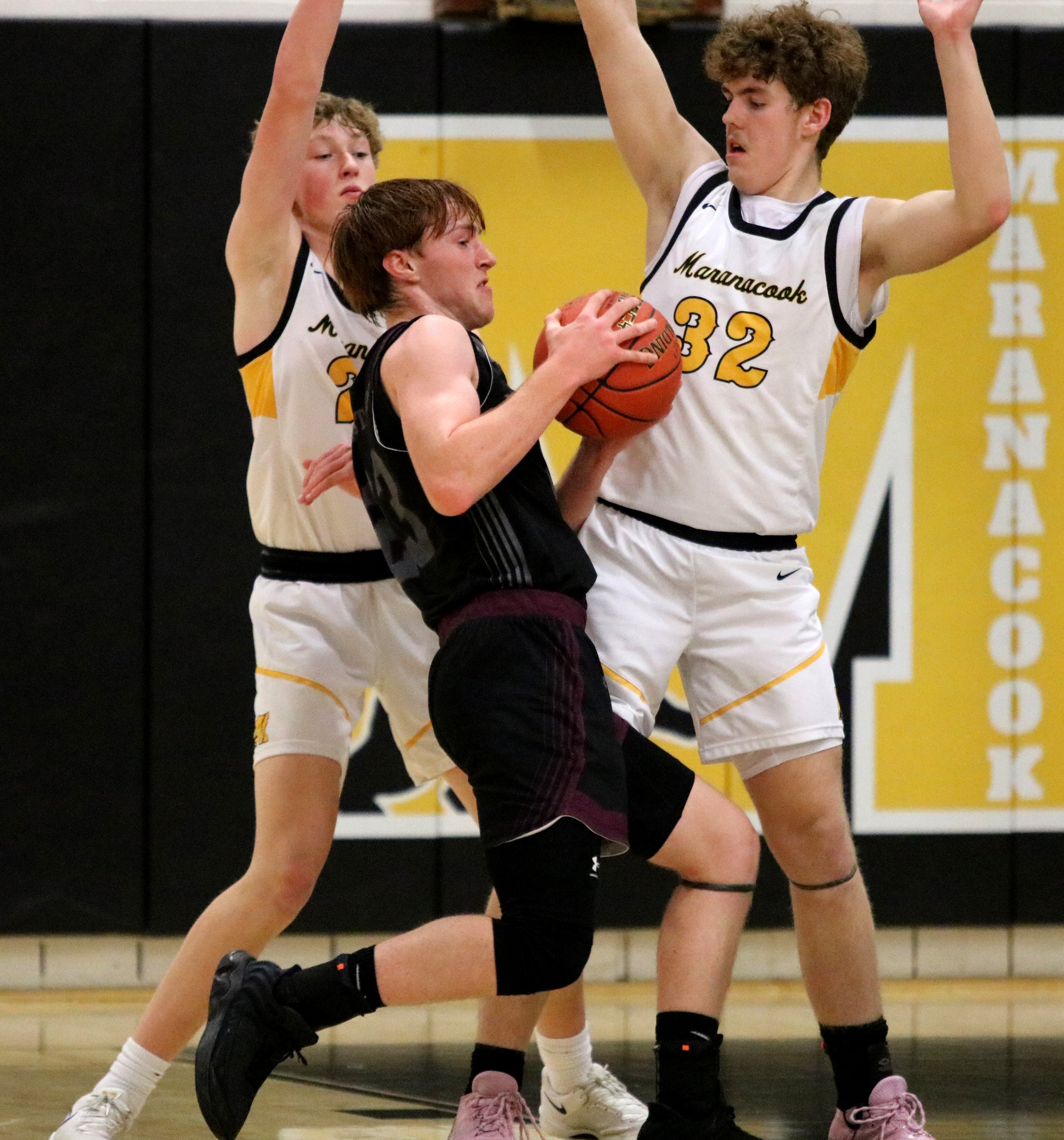 Maranacook’s Alex Labelle (right) and Grady Hreben defend against Jacob Harmon of Monmouth Academy during a Jan. 30 game in Readfield. With a strong returning cast and a pair of intriguing freshmen, the Black Bears are a team to watch in central Maine. (Anna Chadwick/Staff Photographer)
