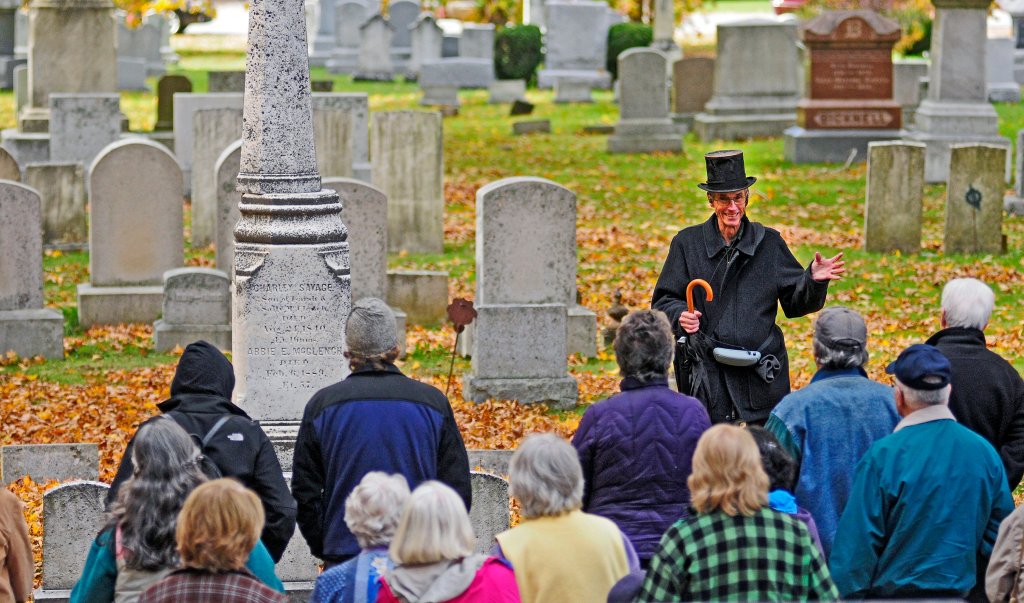 Webber also held well-attended tours of the Hallowell cemetery. He’d wear a bowtie and a suit jacket and a top hat owned by a local funeral director — one of the only times he’d dress up, Catharine said — while telling stories about famous people buried there.