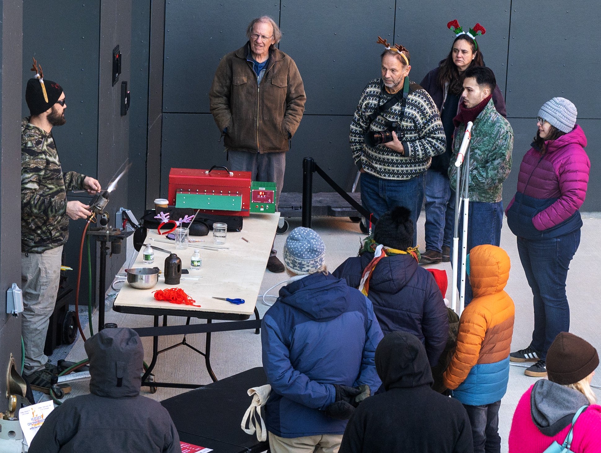 Jonathan Railo, left, demonstrates how he makes glass icicle ornaments in December 2024, during Joy to the Ville at the Paul J. Schupf Art Center in downtown Waterville. (Joe Phelan/Staff Photographer)