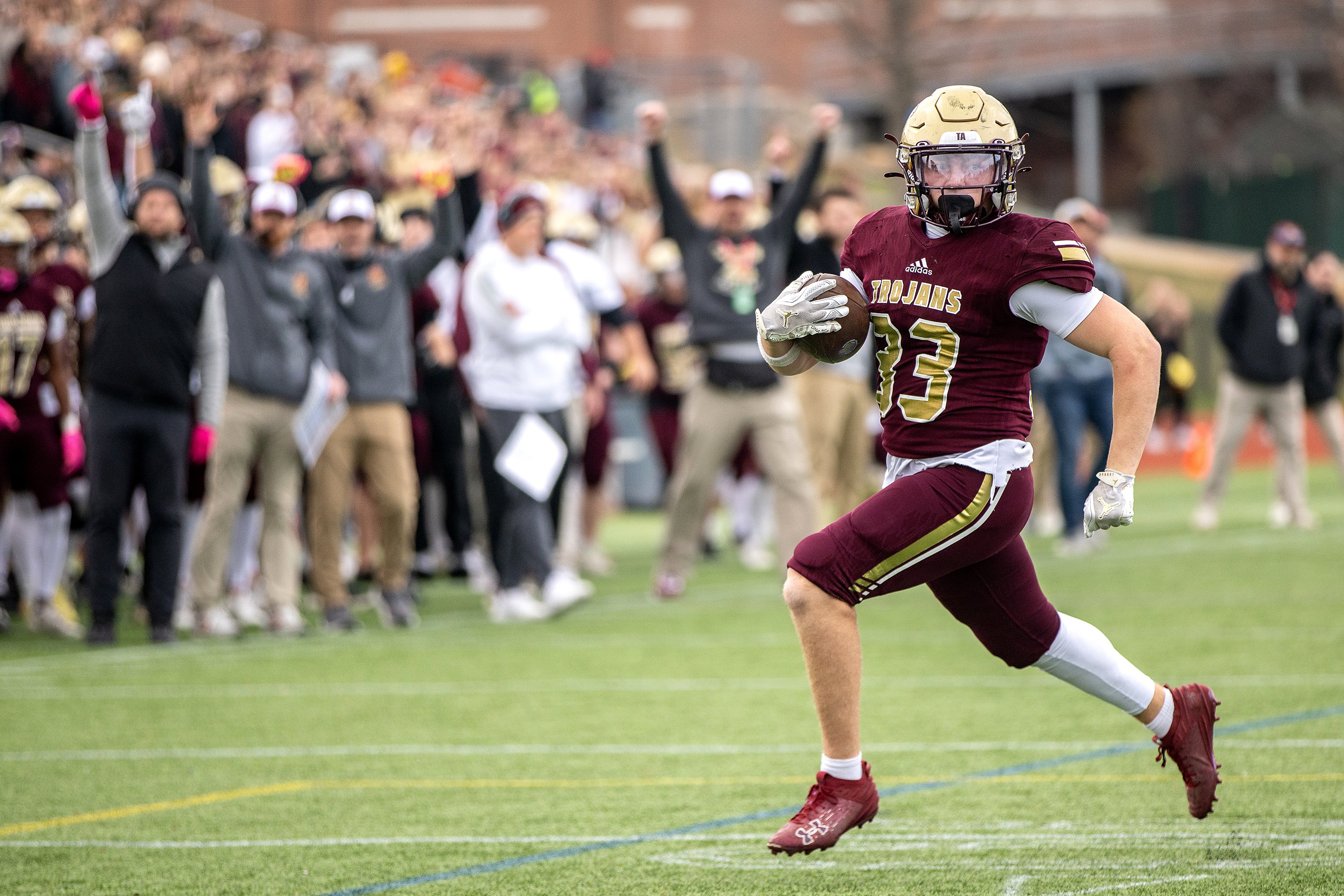 Thornton Academy’s Connor Ayoob runs to the end zone for one of his four touchdowns in the Class A state championship game. (Brianna Soukup/Staff Photographer)