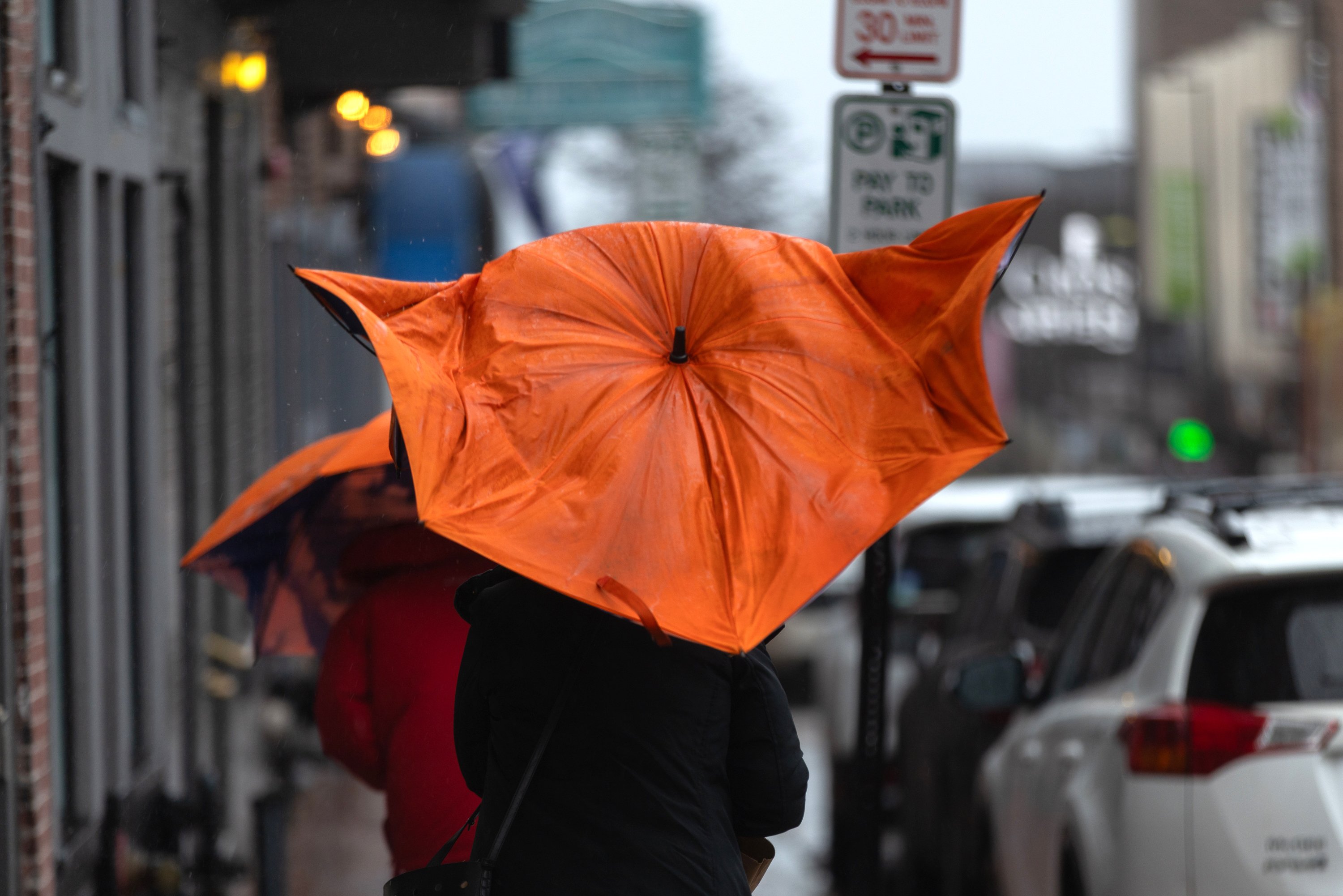 An umbrella is blown up in a wind gust in downtown Portland during rain and high winds Friday. (Brianna Soukup/Staff Photographer)
