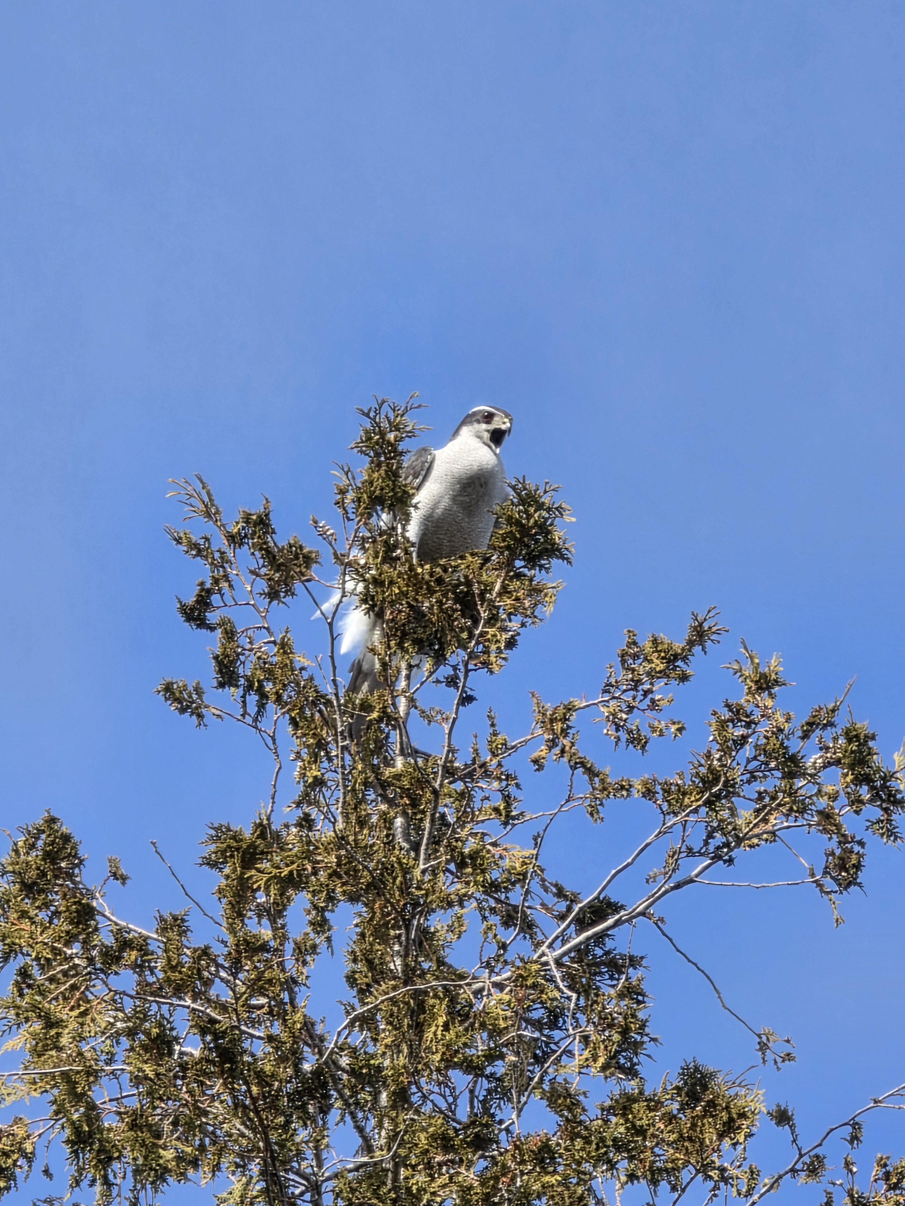 A northern goshawk perches atop a conifer, scanning the treeline on a clear winter day in Maine. (Courtesy photo)