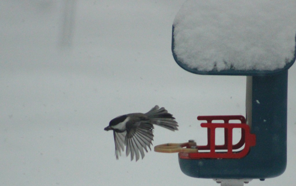 A black-capped chickadee takes flight after grabbing a seed from a backyard feeder following a fresh snowfall in Rangeley. (Dee Menear/Staff Writer)