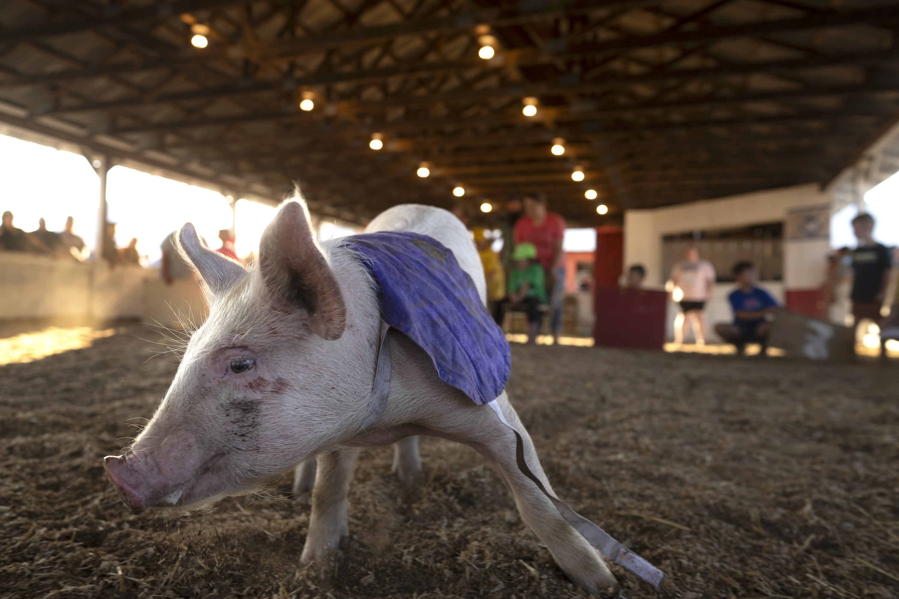 A wayward pig runs through the Livestock Show Ring during a pig-calling competition at the Acton Fair on Aug. 23. (Gregory Rec/Staff Photographer)