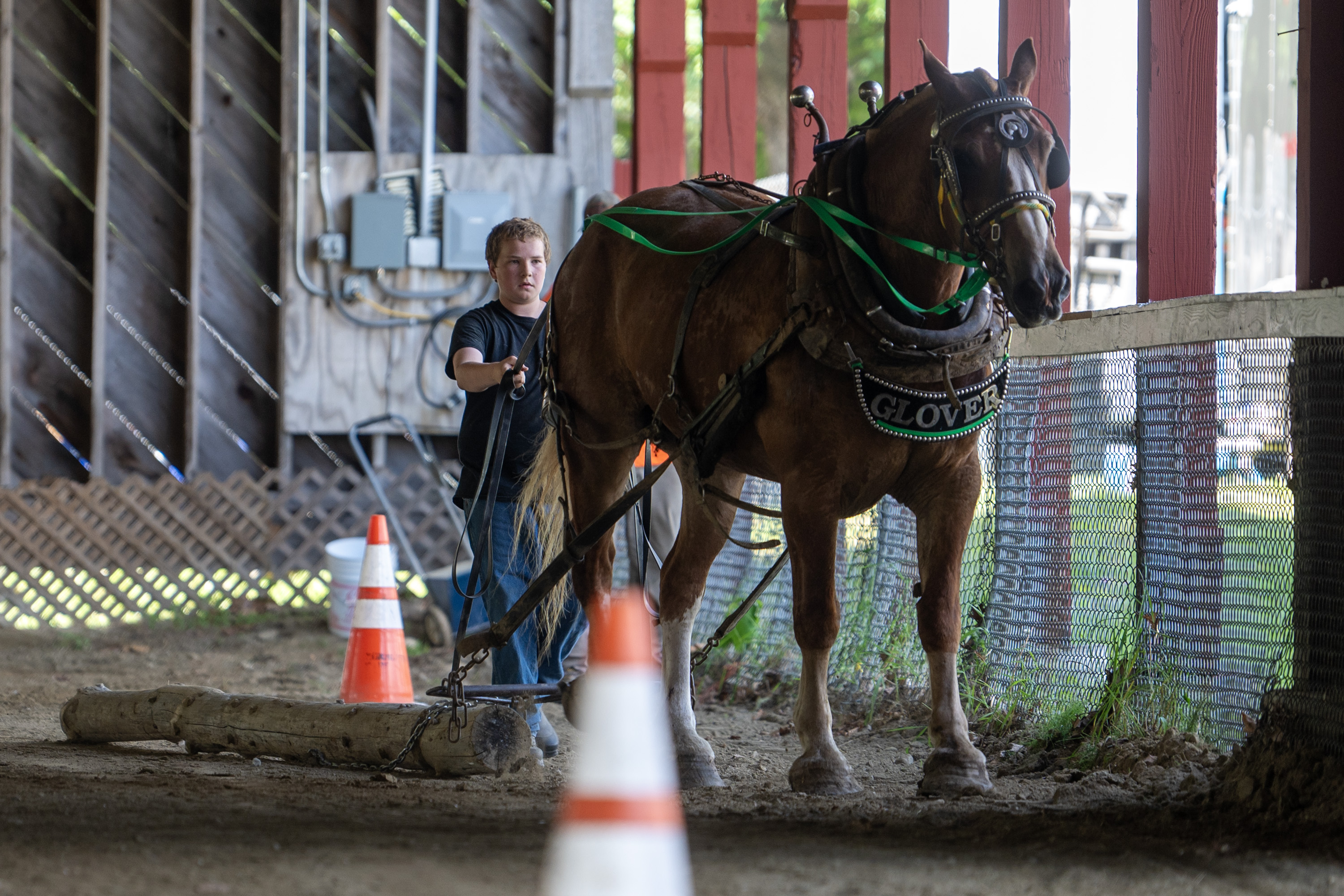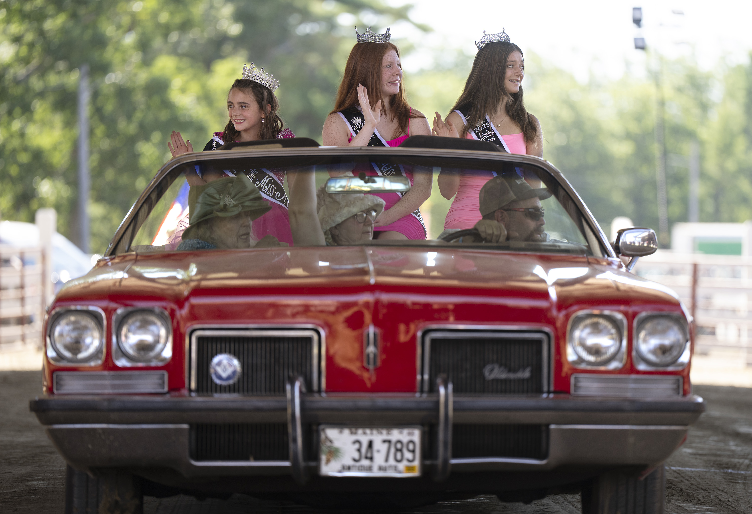 Issac Glover of Rumford guides a Belgian horse named Spanky around the single horse log-twitch course in the pulling ring on the first day of the annual Monmouth Fair on June 25. Competitors in the event at the Monmouth Fairgrounds guided their horse dragging through an obstacle course marked off by cones. It was a timed event, and they lost points for touching or tipping over cones. Glover said he got into pulling because his parents and grandparents are all involved in pulling contests and that the family goes to several fairs to compete over the summer and fall. (Joe Phelan/Staff Photographer)From left, Autumn Grenier, Adelaide McArthur and Emma Robishaw wave to the crowd as they are driven through the grandstand at the Acton Fair during the grand parade on Aug. 23. Grenier was crowned Little Miss Acton Fair; McAthur, Junior Miss Acton Fair; and Robishaw, Miss Acton Fair. (Gregory Rec/Staff Photographer)