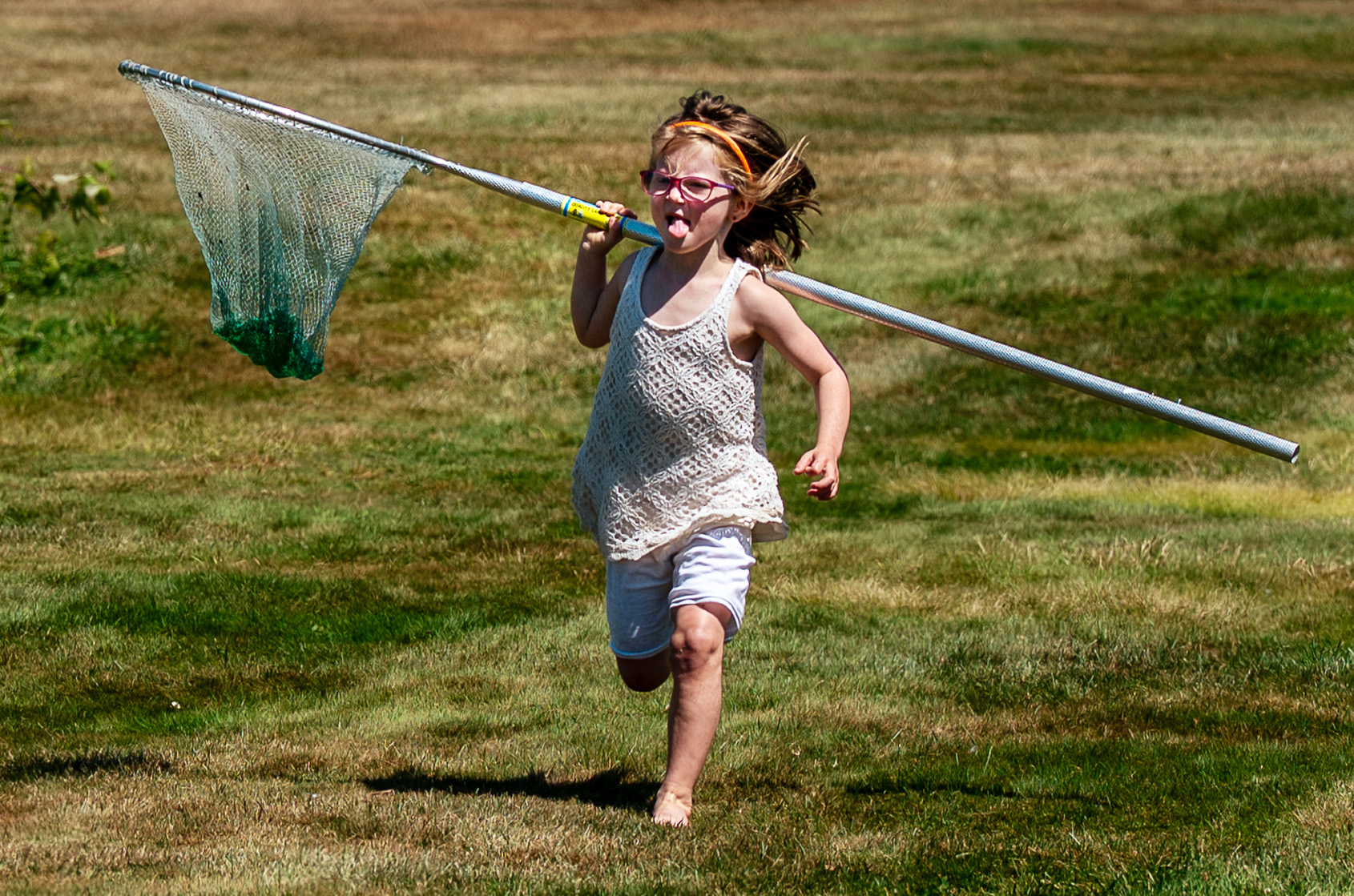 Helley Arington runs toward Rangeley Lake on Aug. 21 with a net to try to catch a frog to enter into the annual Frog Jumping Contest during the Blueberry Festival at Town Cove Park in Rangeley. (Russ Dillingham/Staff Photographer)