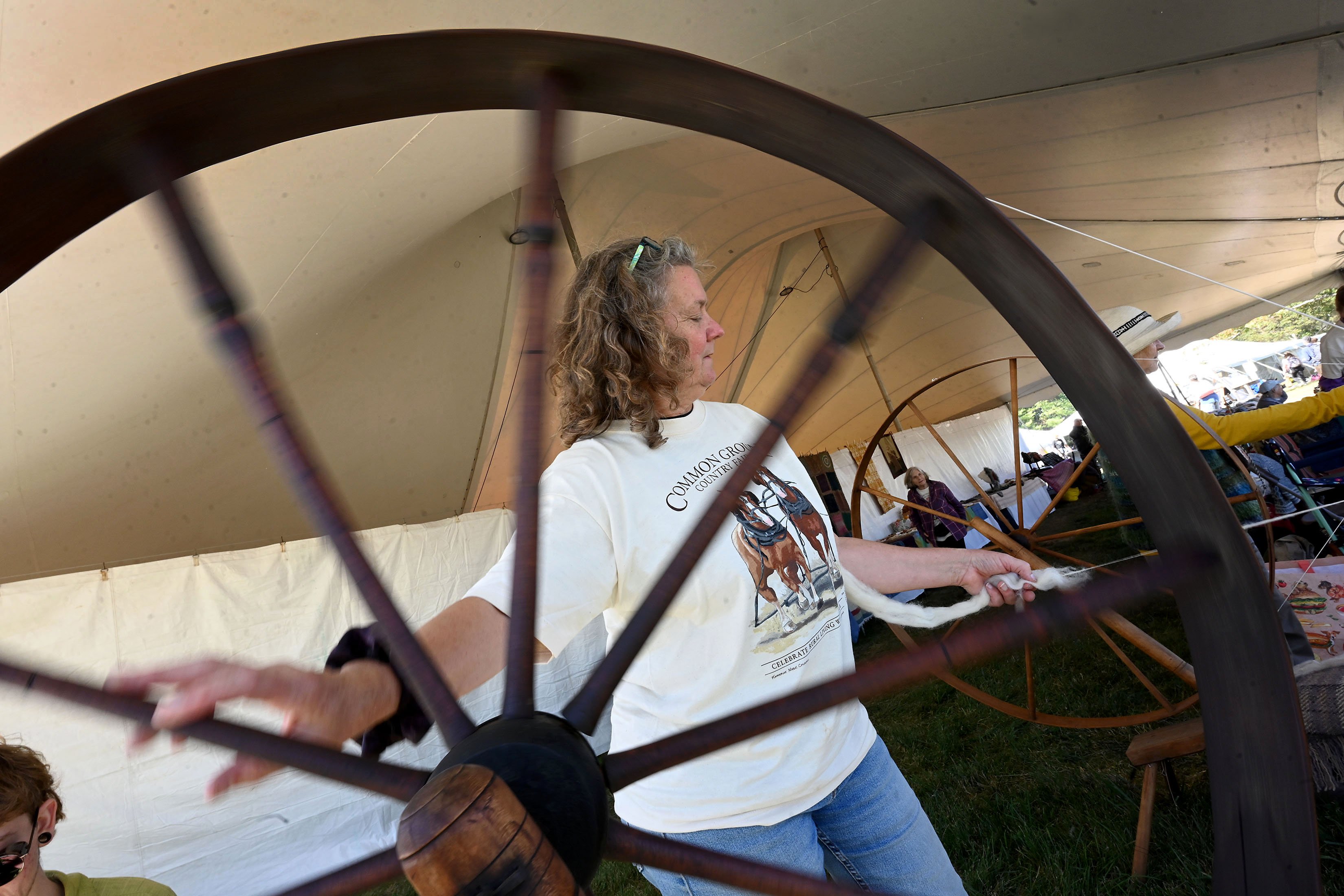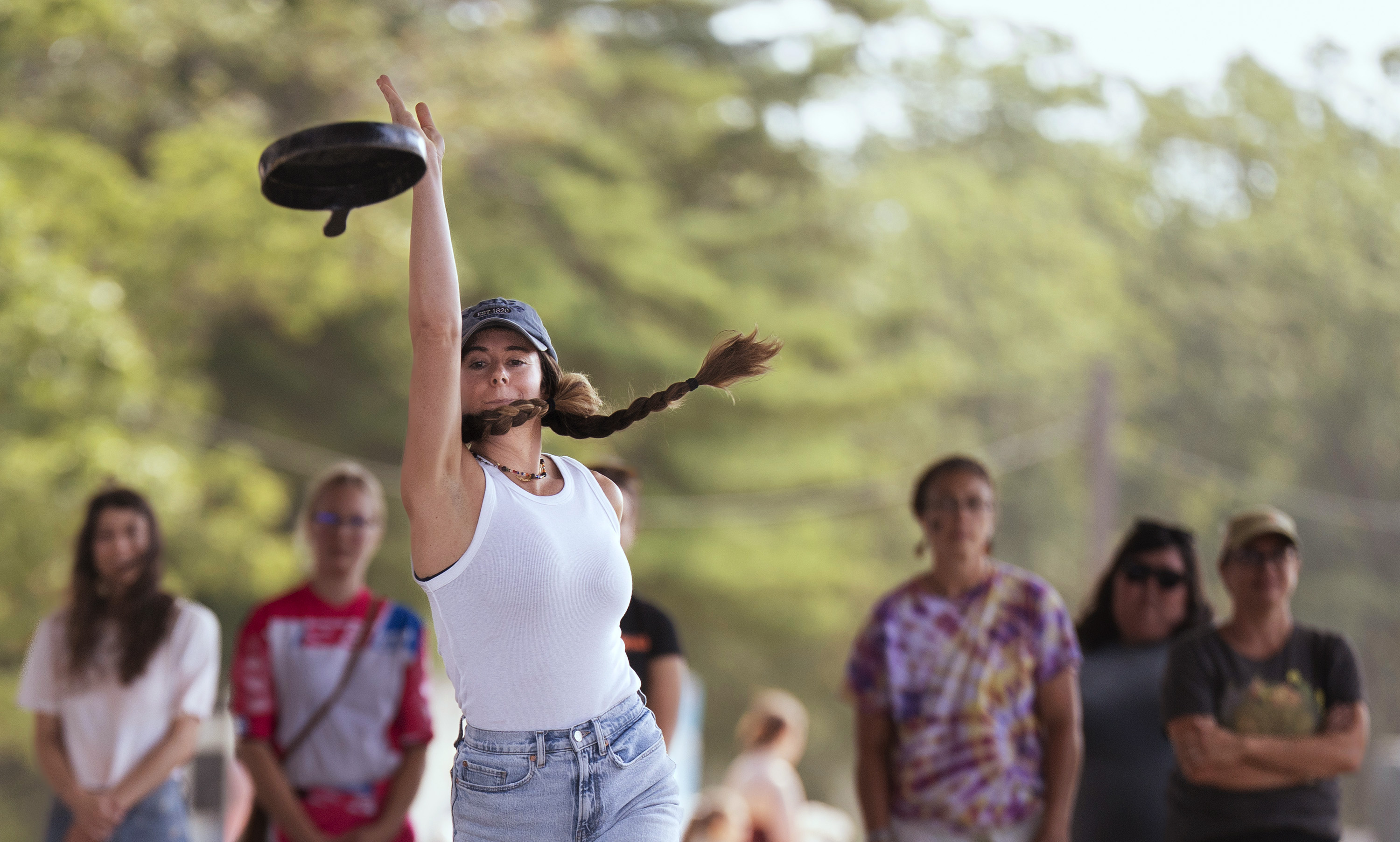 Kiwinik Dana, a member of the Penobscot Tribe, dances during the Community Days gathering of the Houlton Band of Maliseets in Littleton on Sep. 6. Dana was the youth male head dancer at the gathering. (Gregory Rec/Staff Photographer)Susan of the East turns her great wheel (also known as a walking wheel) while spinning sheep wool into fine yarn during a demonstration at the Common Ground Country Fair in Unity on Sept. 19. The fair is organized by the Maine Organic Farmers and Gardeners Association. (Rich Abrahamson/Staff Photographer)Kristyn Callahan of Acton throws a skillet during the skillet toss competition at the Acton Fair on Aug. 23. Callahan threw the skillet 41 feet, 7 inches. (Gregory Rec/Staff Photographer)Asa Mehuren, 11, and his cow Sunshine compete in the 4-H youth dairy show during opening day at the Union Fair on July 30. During the show, Mehuren is judged on how well Sunshine was cleaned, clipped, prepared as well as handled while in the ring. (Anna Chadwick/Staff Photographer)