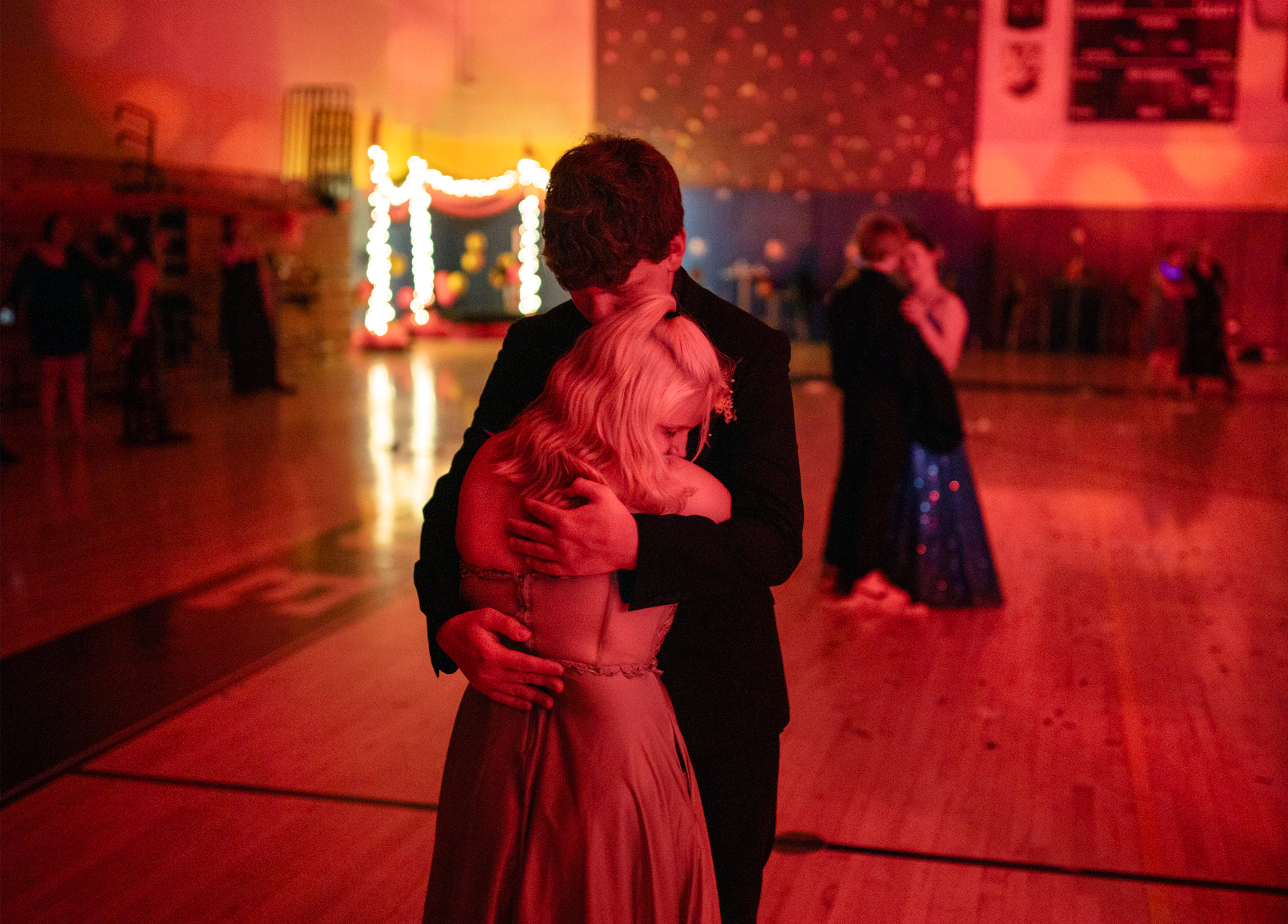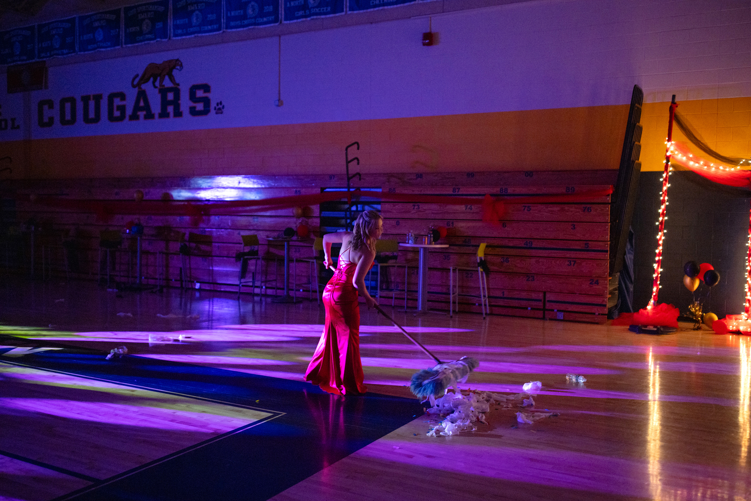 Heavenly Vernesoni and Michael Hall slow-dance Mt. Blue High School’s prom.Madi Weston sweeps up confetti and toilet paper at the end of Mt. Blue High School’s prom. Weston is a junior on the prom committee who helped decorate for the dance and stayed late to clean up.