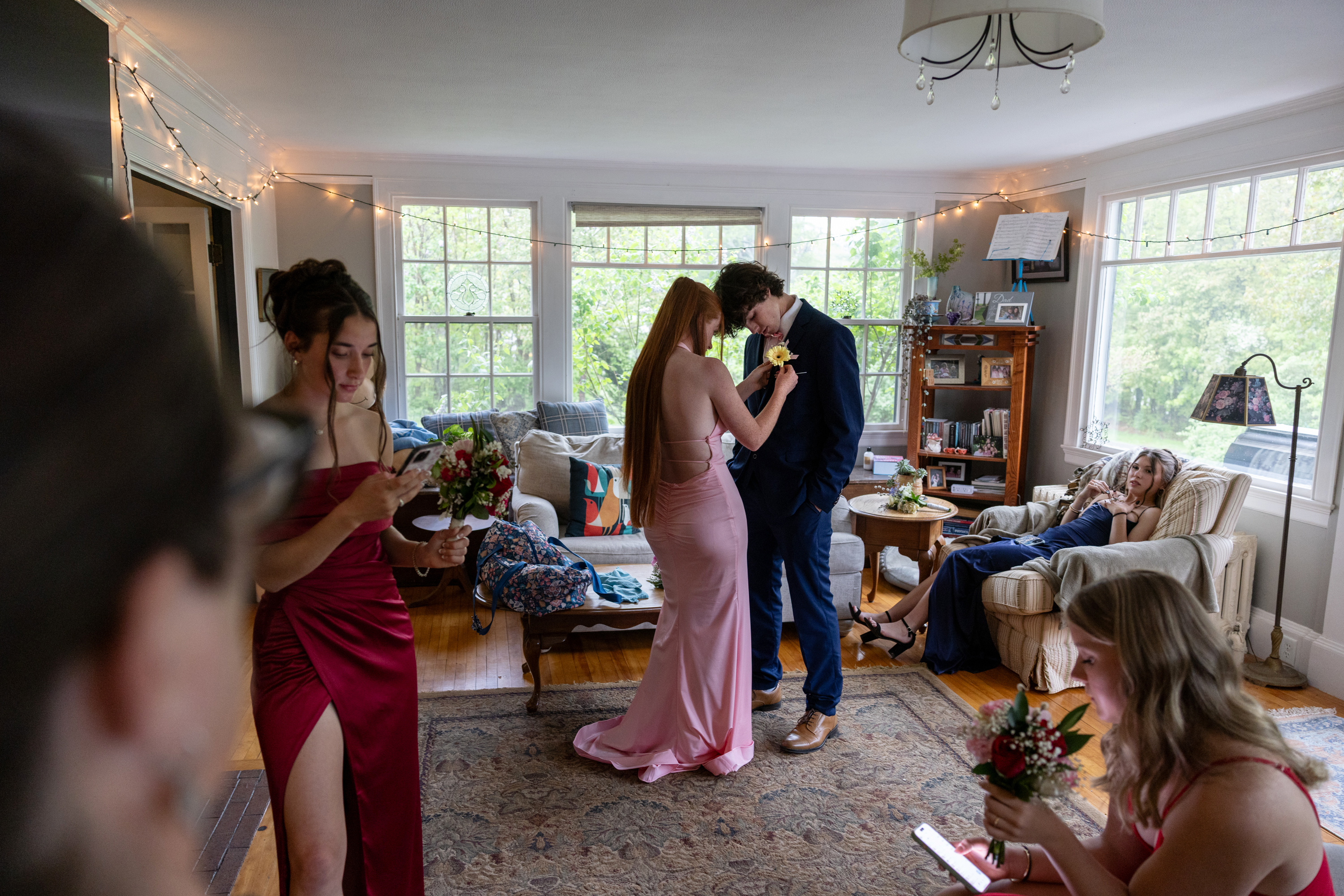 Bree Griffin pins a boutonniere onto her boyfriend Bryce Wilcox, 18, a senior at Mt. Abram, before the Mt. Blue High School prom.