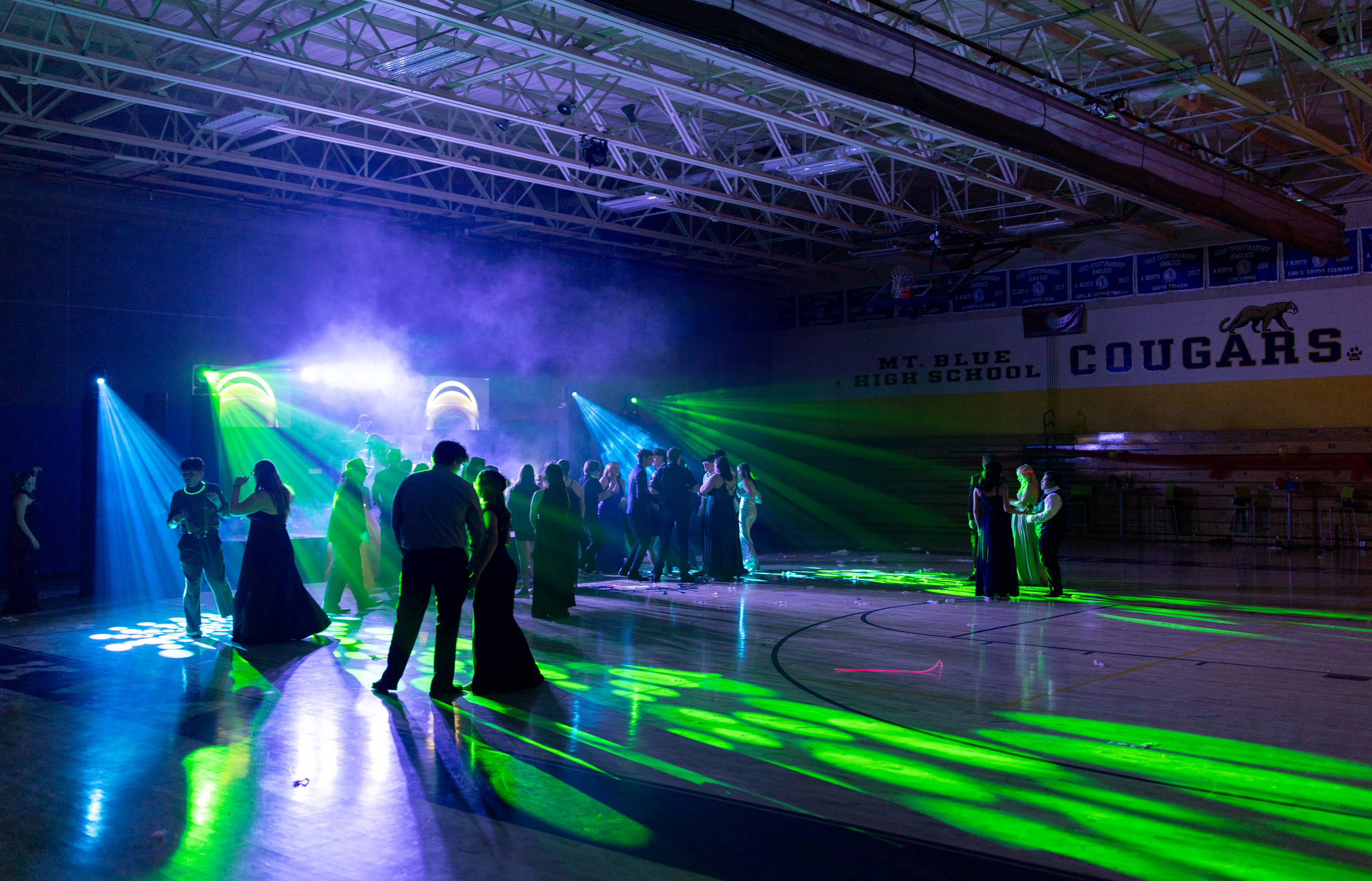 A colorful spotlight hits Rebecca Sweatt as she dances at Mt. Blue High School’s prom in Farmington.