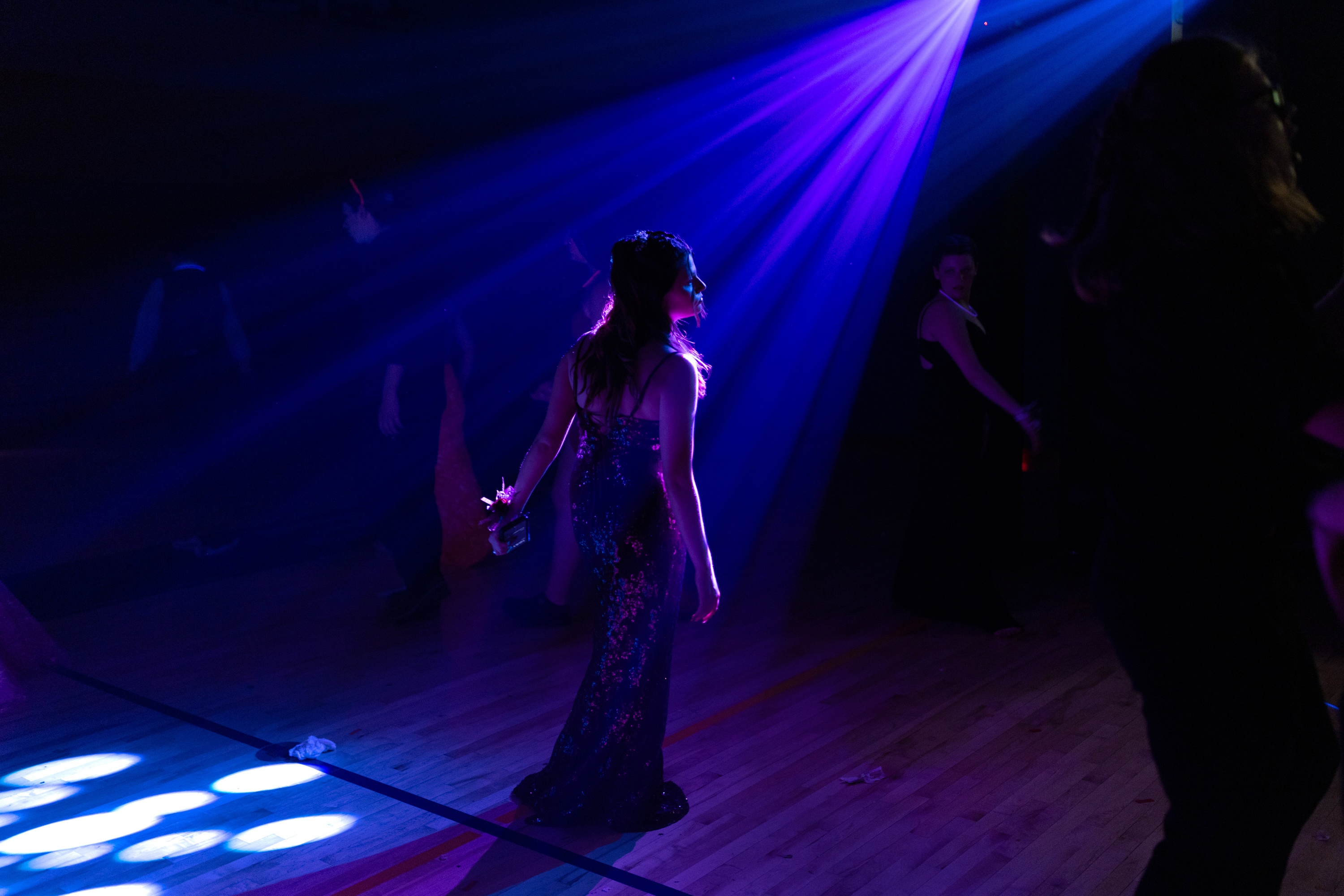 FARMINGTON, ME – MAY 17: A colorful spotlight hits Rebecca Sweatt as she dances at Mt. Blue High School’s prom in Farmington on Saturday, May 17, 2025. (Staff photo by Brianna Soukup/Staff Photographer)
