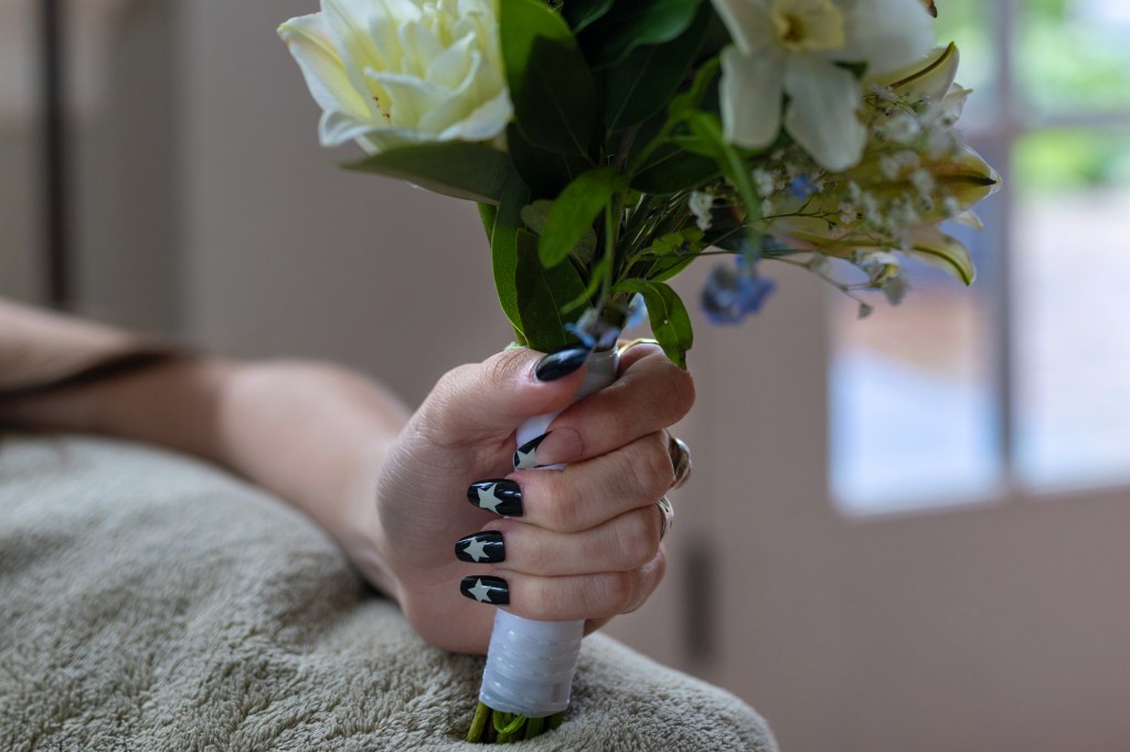 Giselle Couillard, 17, holds onto the bouquet she made with her friends before their prom at Mt. Blue High School.