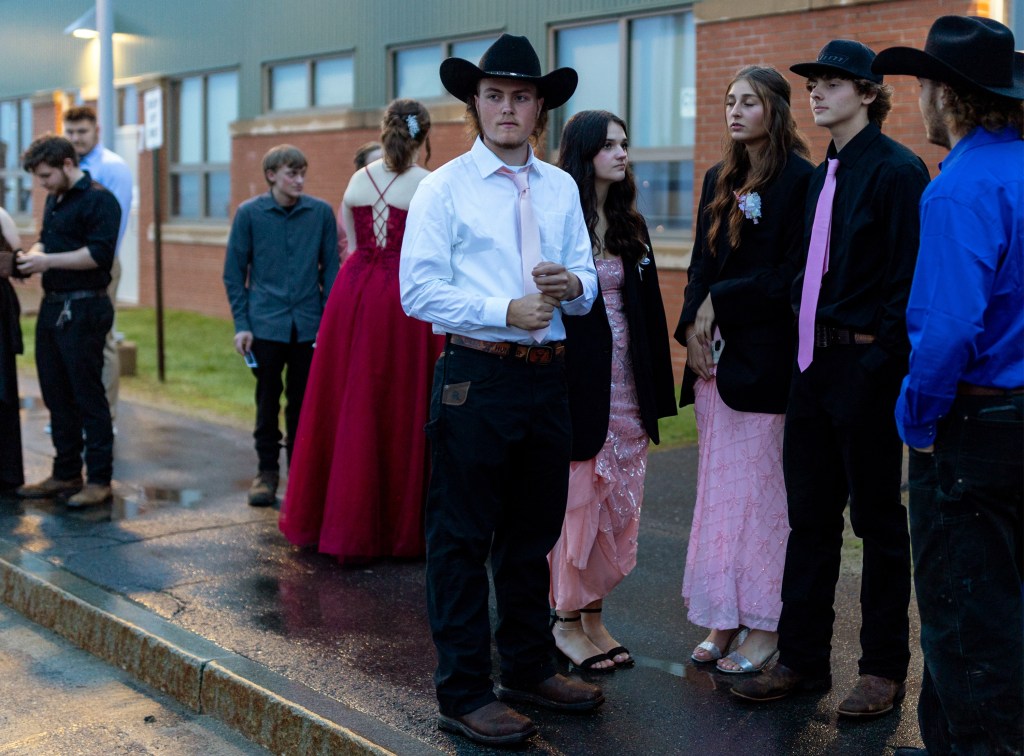 Owen Northrup, center, sports a cowboy hat for Mt. Blue High School’s prom in Farmington.Students gather in the gym to dance at Mt. Blue’s prom.Liam Dorr, center left, and Avery Jessen, center right, did their hair in liberty spikes for their senior prom. “We’re both kind of punk and alternative,” Jessen said. “This just injects a little fun into it.”