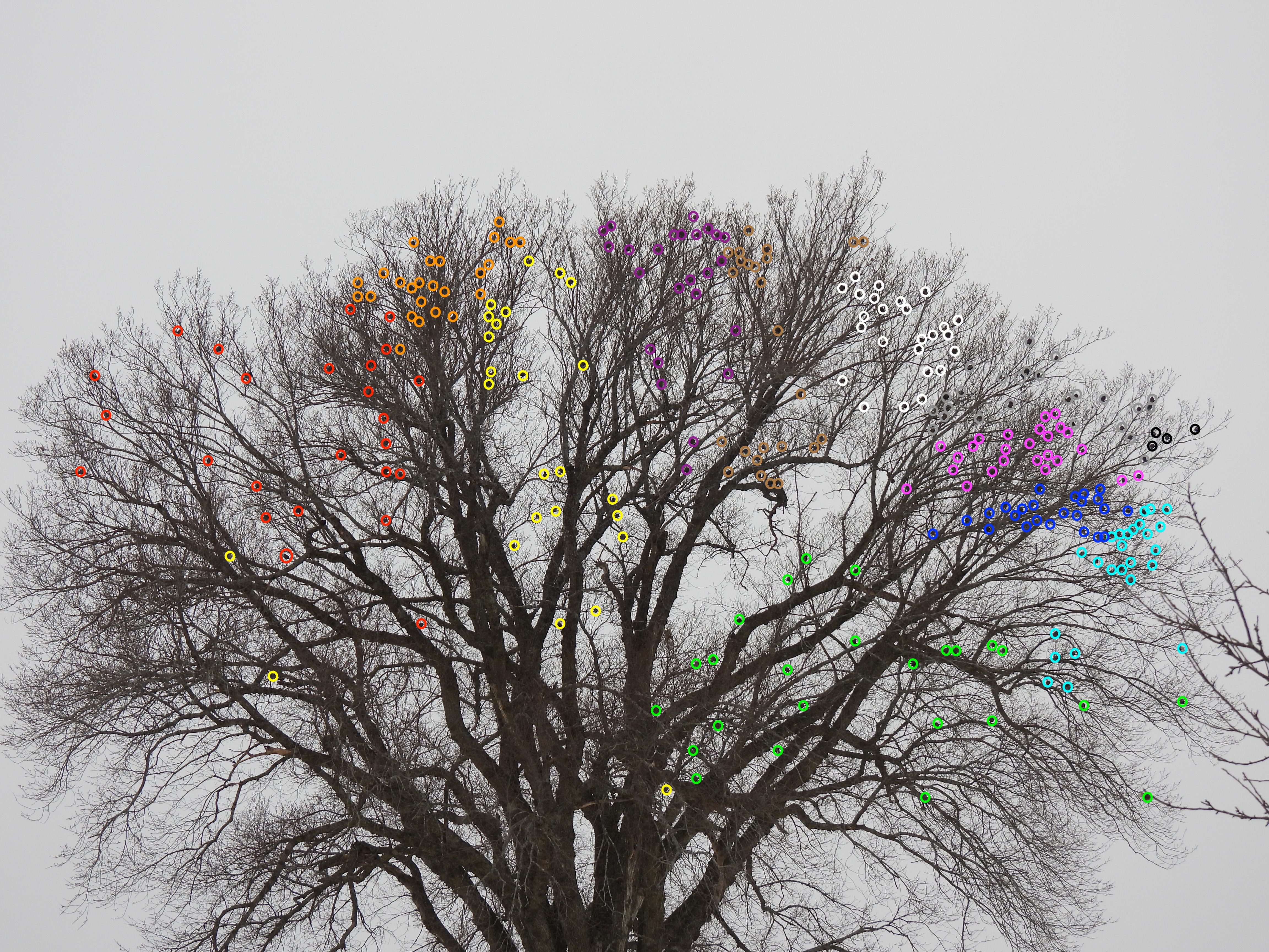 European starlings fill a leafless tree in Farmington during the Dec. 14 Christmas Bird Count. The flock, estimated at about 275 birds, was tallied using color-coded groups to aid counting during the Farmington Circle survey. (Courtesy of Tim Flight)