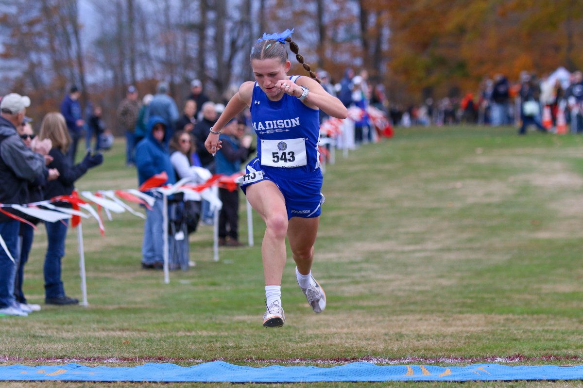 Madison's BryAnna Hagopian leaps across the finish line to win the Class C girls race at the Southern Maine regional on Oct. 25 in Cumberland. Hagopian finished in 19:59.60. (Cooper Sullivan/Staff Photographer)