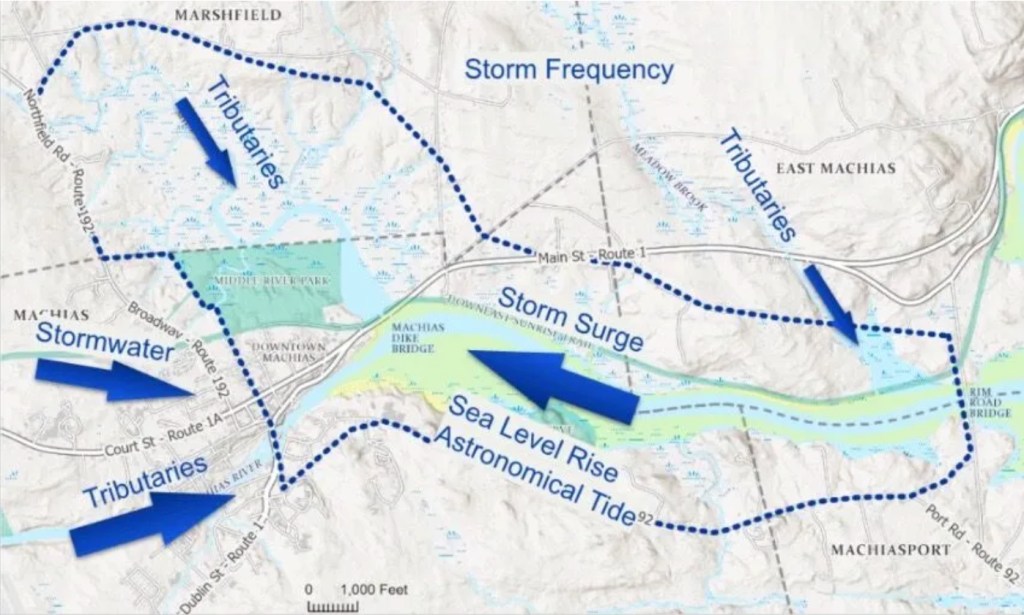 Downtown Machias faces flood risk from both directions — rising sea levels in the ocean and swelling river tributaries fueled by heavier rainfall, snowmelt and runoff. When both surge at once, floods like the Jan. 10, 2024, event can strike quickly and unpredictably, leaving residents stranded and damaging buildings.