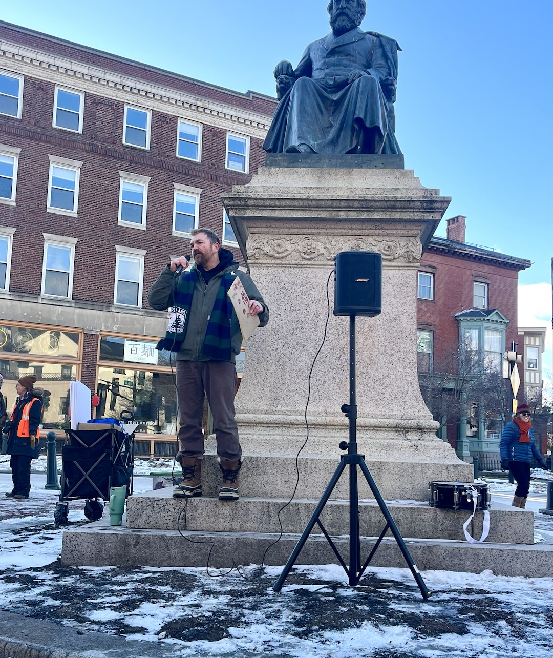 The chant rang out across Portland’s Longfellow Square on Saturday afternoon, where over 100 people gathered to protest President Trump’s early morning strike against Venezuela, which resulted in the capture of Venezuelan President Nicolás Maduro.
