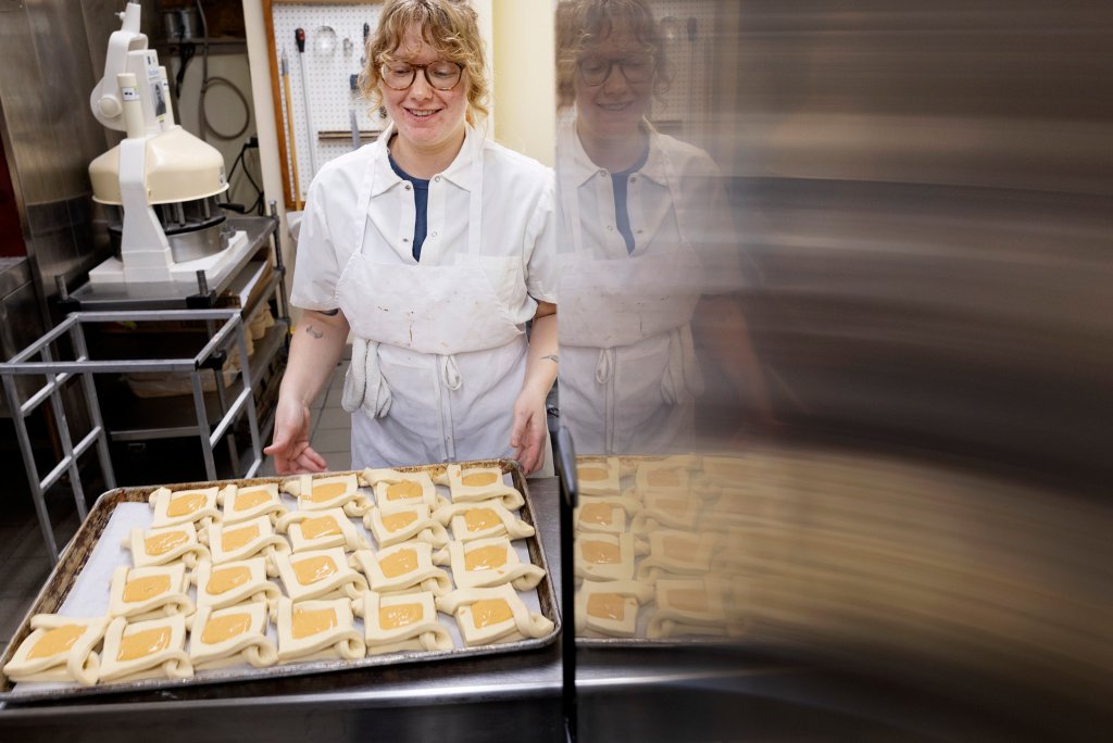 Chanis folds the squares diagonally in half, partly slices the edges, then reopens the square and folds the flaps over to create a diamond-shaped pocket ready to be filled. Chanis and Dutch add dollops of pumpkin pie-flavored cream cheese base to the pocket. They make a full batch this way, then freeze and bake the Danish fresh as needed throughout the week in Dutch’s four-deck, steam-generating Empire MiniTube oven.