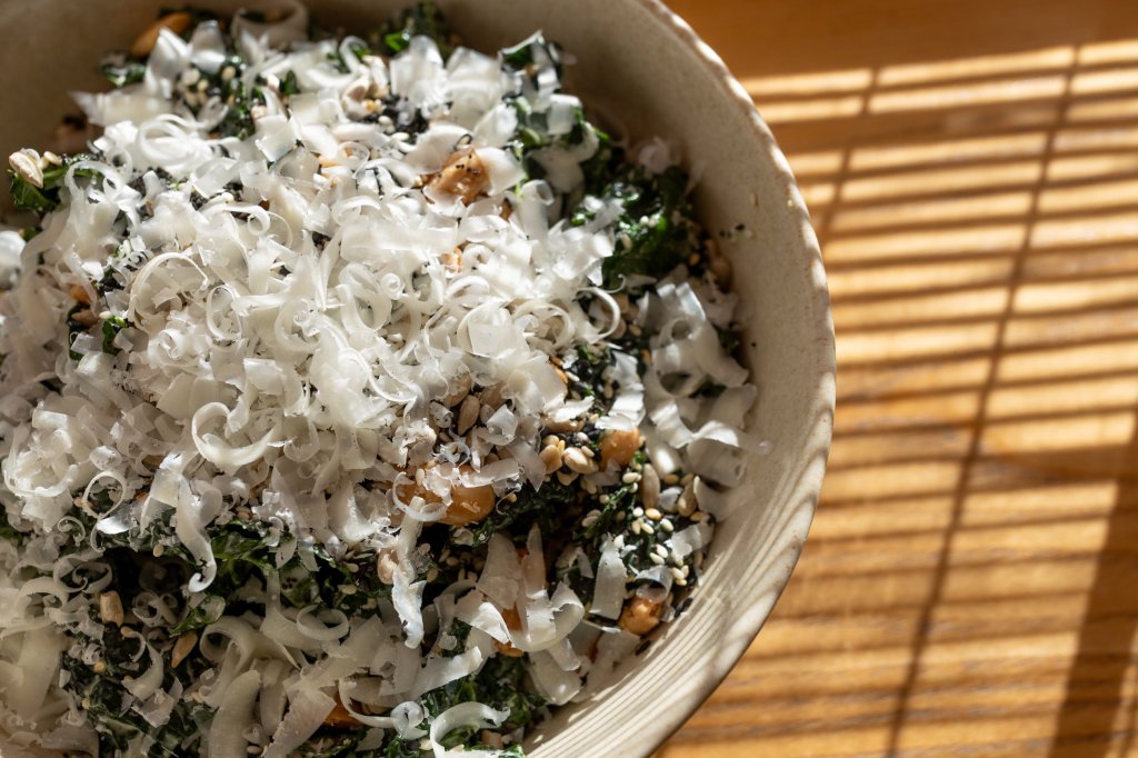 It starts with chopped Lacinato kale from Chase’s Daily Farm in Belfast. Malyniwsky seasons the leaves with salt and freshly ground black pepper, then massages them briskly to tenderize and help them absorb the salt. He gives the salad a squeeze of lemon juice, and then, instead of the olive oil he’d usually add to the kale salad, tops it with creamy Parmesan dressing.