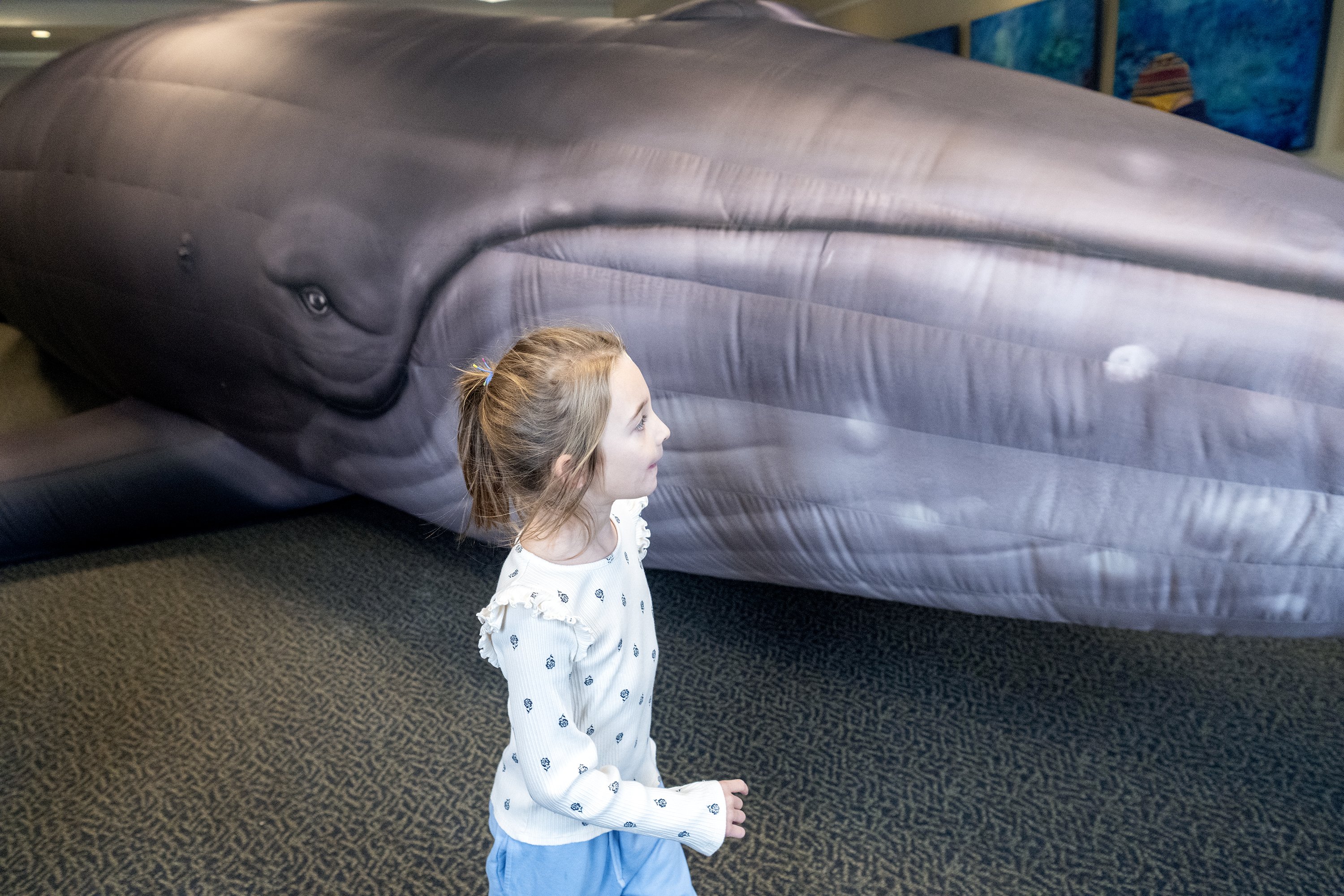 At the Topsham library, Woodend led the children inside the whale in groups of 20, pointed out the whale’s heart, lungs and stomach, and shared whale facts, including how and what they eat.