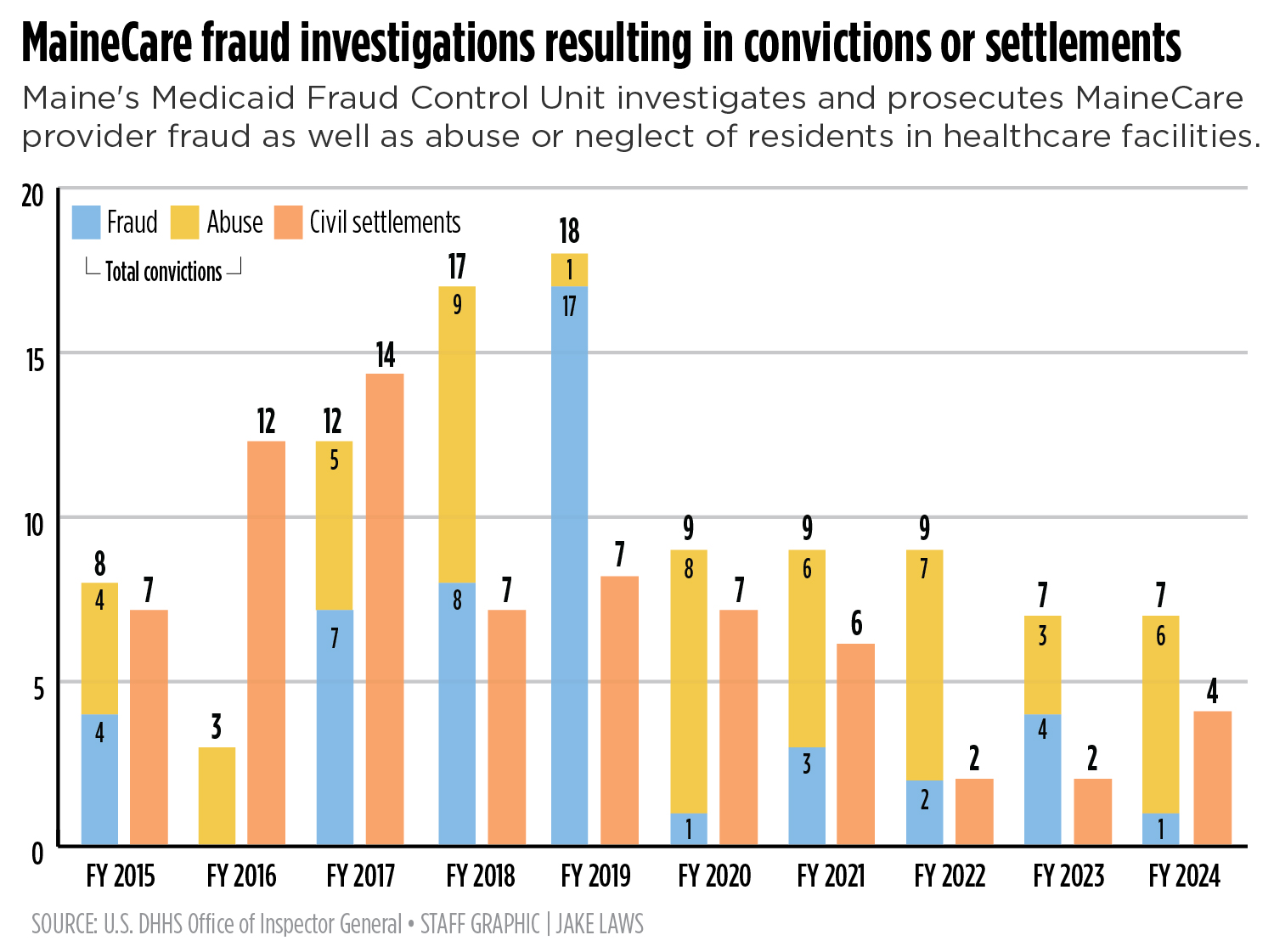 The Maine unit employed 10 people as of 2024, according to the most recent federal data. It investigated 58 cases that fiscal year, most of which were fraud-related. Those investigations resulted in eight indictments and seven convictions, including one fraud conviction and six abuse and neglect convictions. There were also four civil settlements.