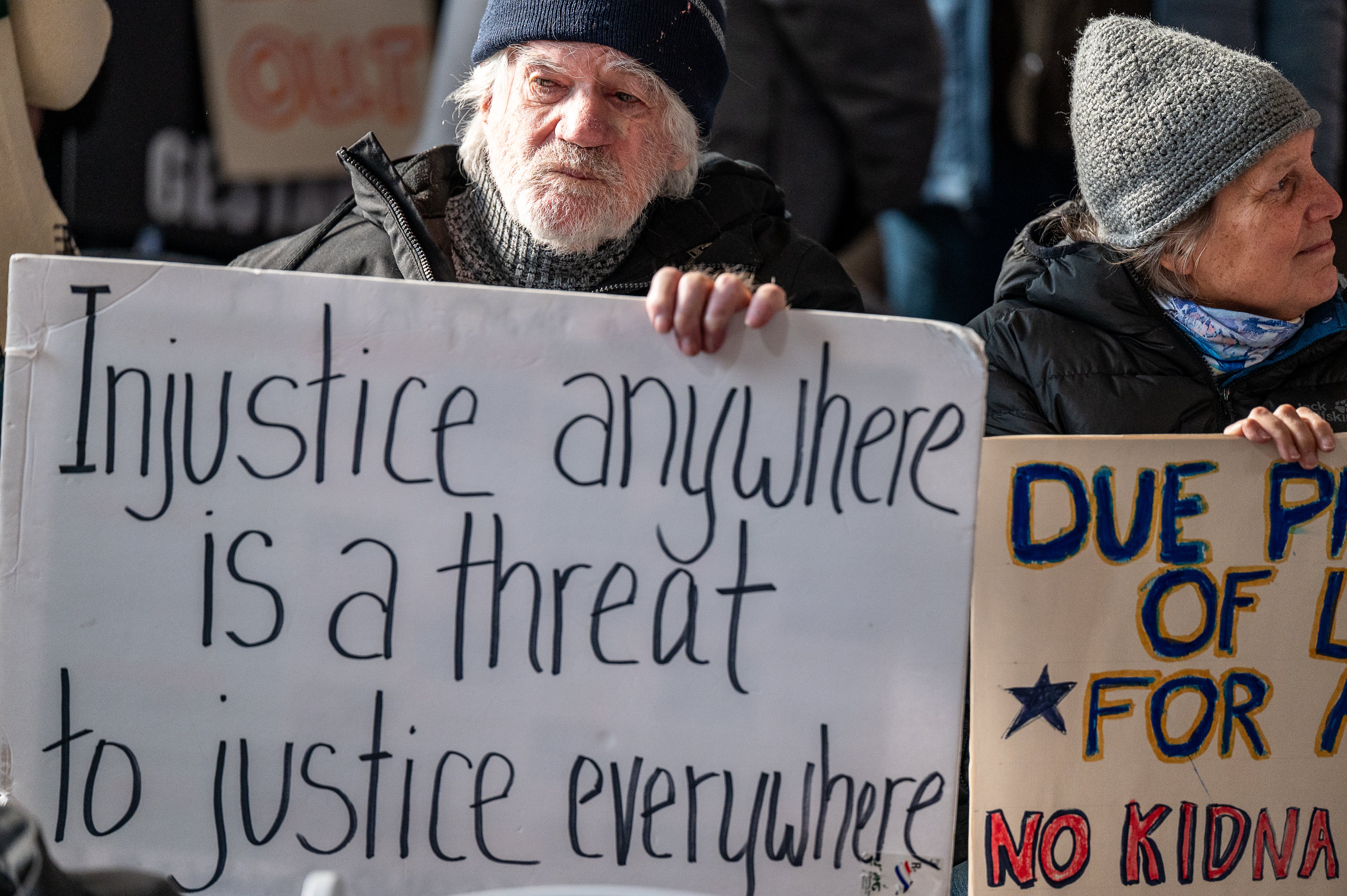 Dresden resident Rusty Dewsnap, an Air Force veteran, elected to stay out in the cold with several other hundreds of people. Dewsnap said he made the ride out to Lewiston to protest ICE and the Trump administration’s misdeeds.