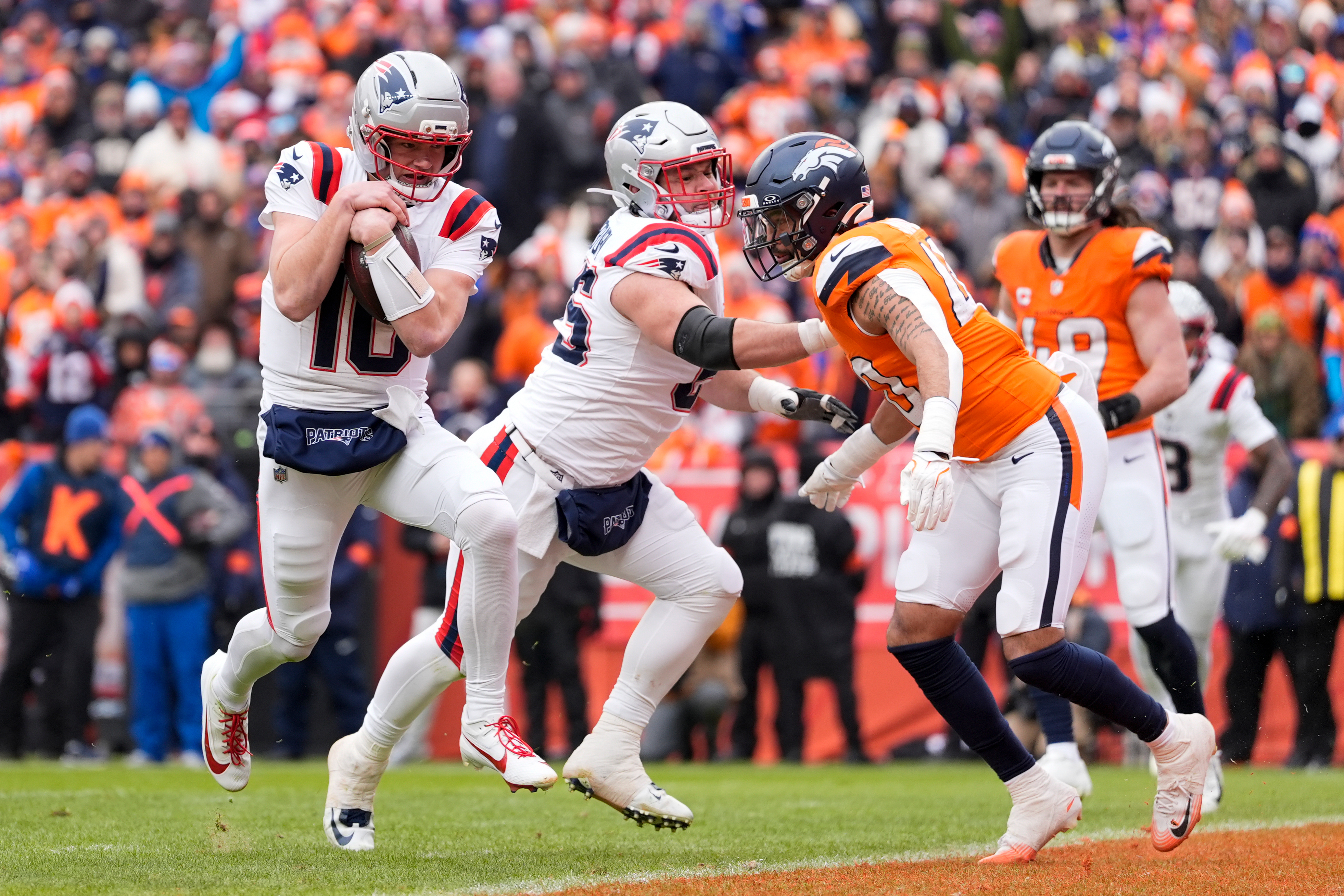 Christian Gonzalez intercepted Jarrett Stidham, starting in place of an injured Bo Nix with 2:11 remaining, for New England’s second takeaway. The first set up the Patriots with a short field and led to Maye’s touchdown scamper that tied it at 7 heading into halftime.