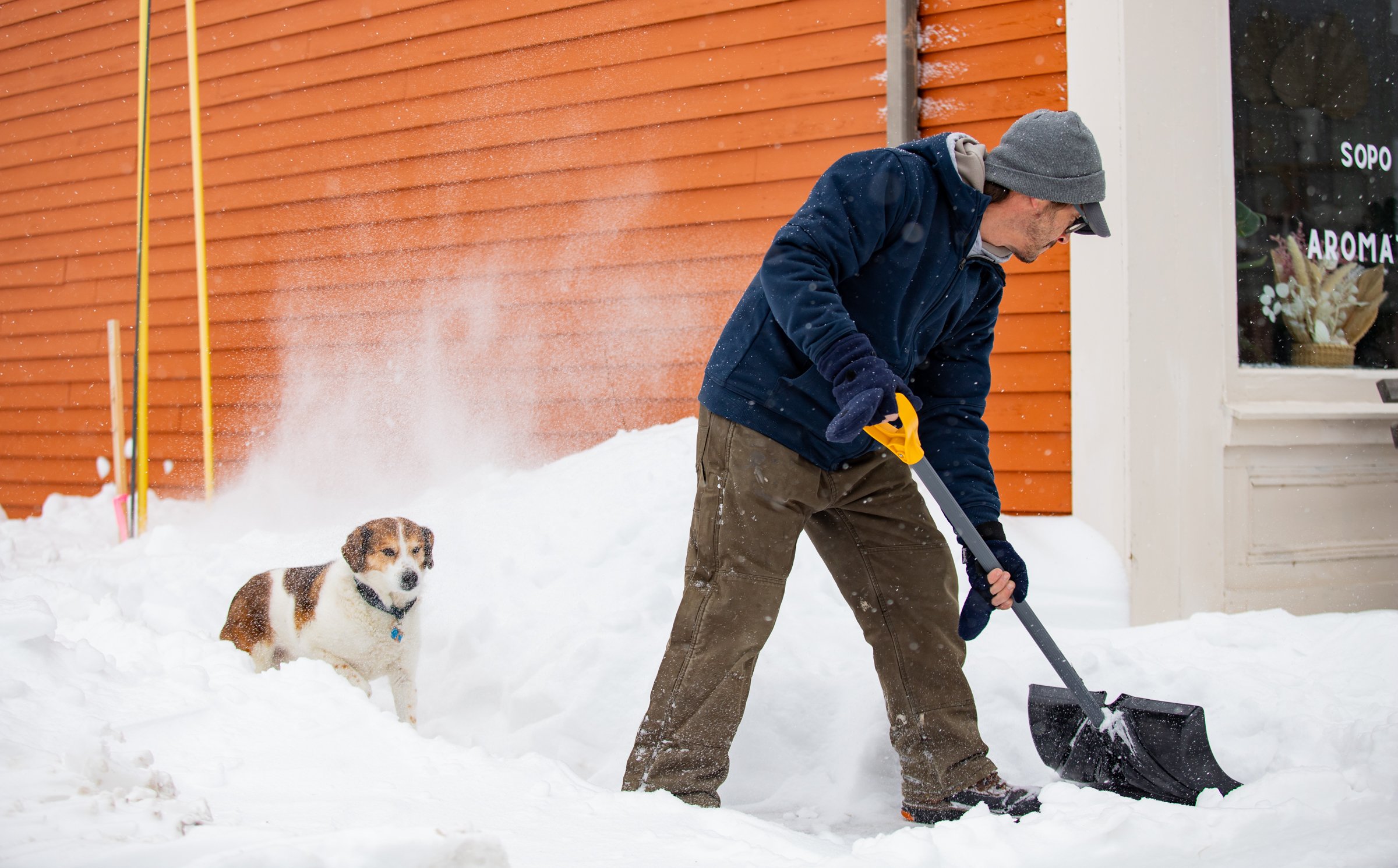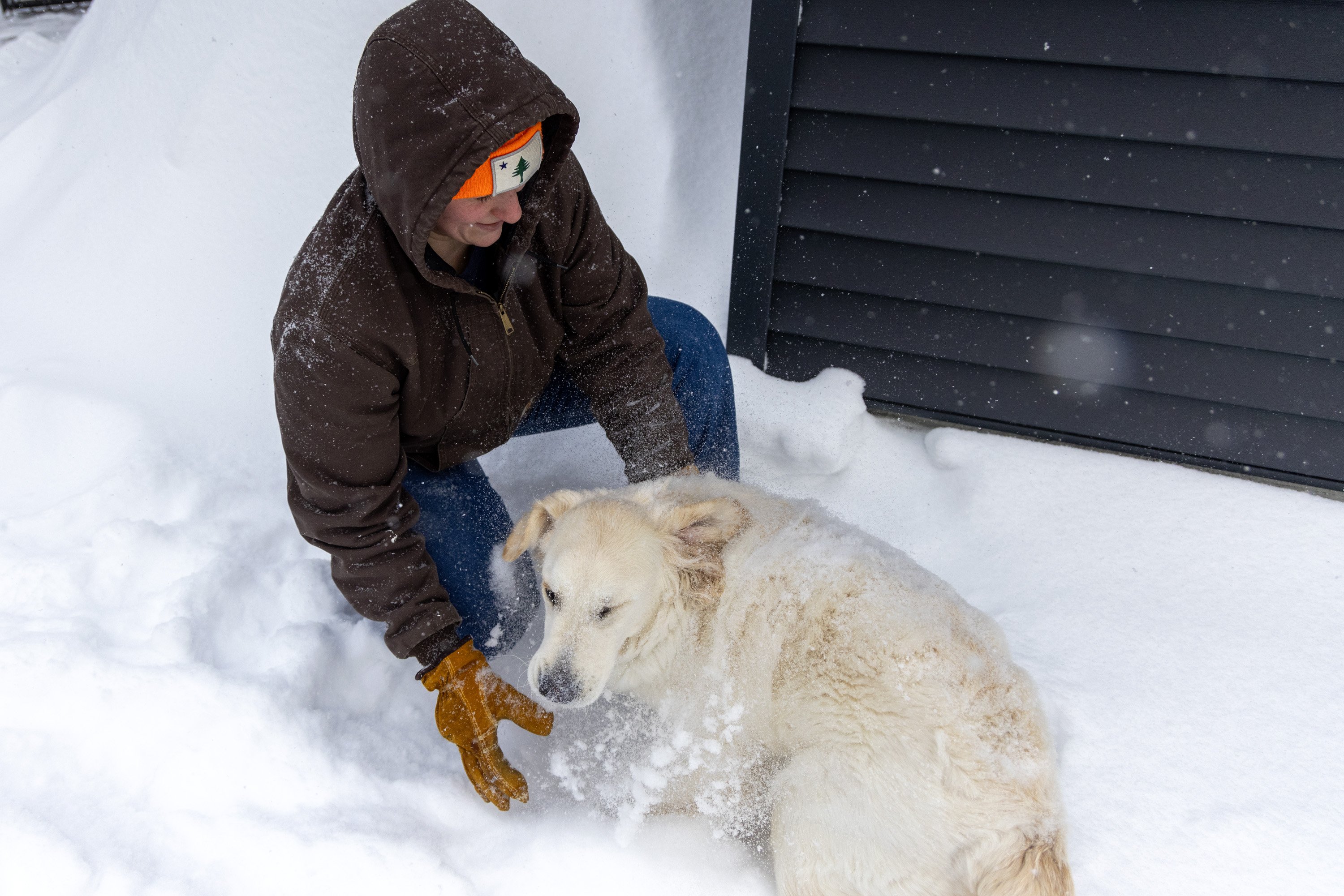 Josie, a beagle and Jack Russell terrier mix, squints through a face full of snow as owner Neal Googins shovels the sidewalk Monday in South Portland’s Knightville neighborhood. Googins lives around the corner but said that shoveling more of the walk was “just being neighborly.” (Libby Kamrowski Kenny/Staff Photographer)Billow, a 9-month-old golden retriever, plays in the snow with her owner Cece Racine outside their home Monday in Gardiner. (Anna Chadwick/Staff Photographer)Amos Woodward of Auburn grooms the cross country ski trails at the Auburn Nordic Ski Association trails in Auburn on Monday. The ANSA volunteer said that he has not seen a snow storm like this one in at least eight years. “We used to get these all the time, but not anymore,” Woodward said about the storm that dropped over a foot of snow in Auburn. (Daryn Slover/Staff Photographer)Derek Smith clears the parking area for an apartment building that he helps maintain in downtown Lewiston on Monday. (Daryn Slover/Staff Photographer)