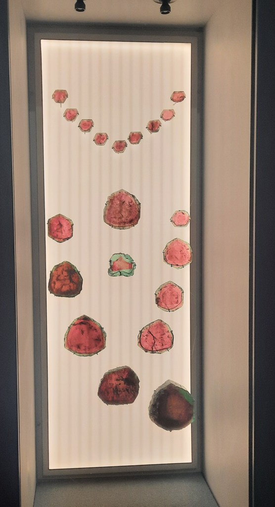 A selection of Maine watermelon tourmaline specimens on display June 5, 2025, at the Maine Mineral & Gem Museum in Bethel, highlighting the pink-and-green crystals that helped establish western Maine as a world-class tourmaline locality. (Rebecca Richard/Staff writer)