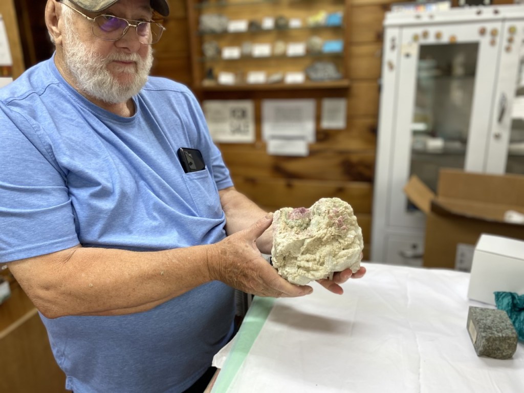 Dennis Gross, chair of the 59th Western Maine Gem, Mineral and Jewelry Show, in 2022 holds a specimen of Maine watermelon tourmaline in cleavelandite from the Nevel Mine in Newry. Finds like this highlight the continued legacy of western Maine tourmaline, decades after landmark discoveries such as the 1972 “Big Find.” (Ambrose Ward/Staff writer)