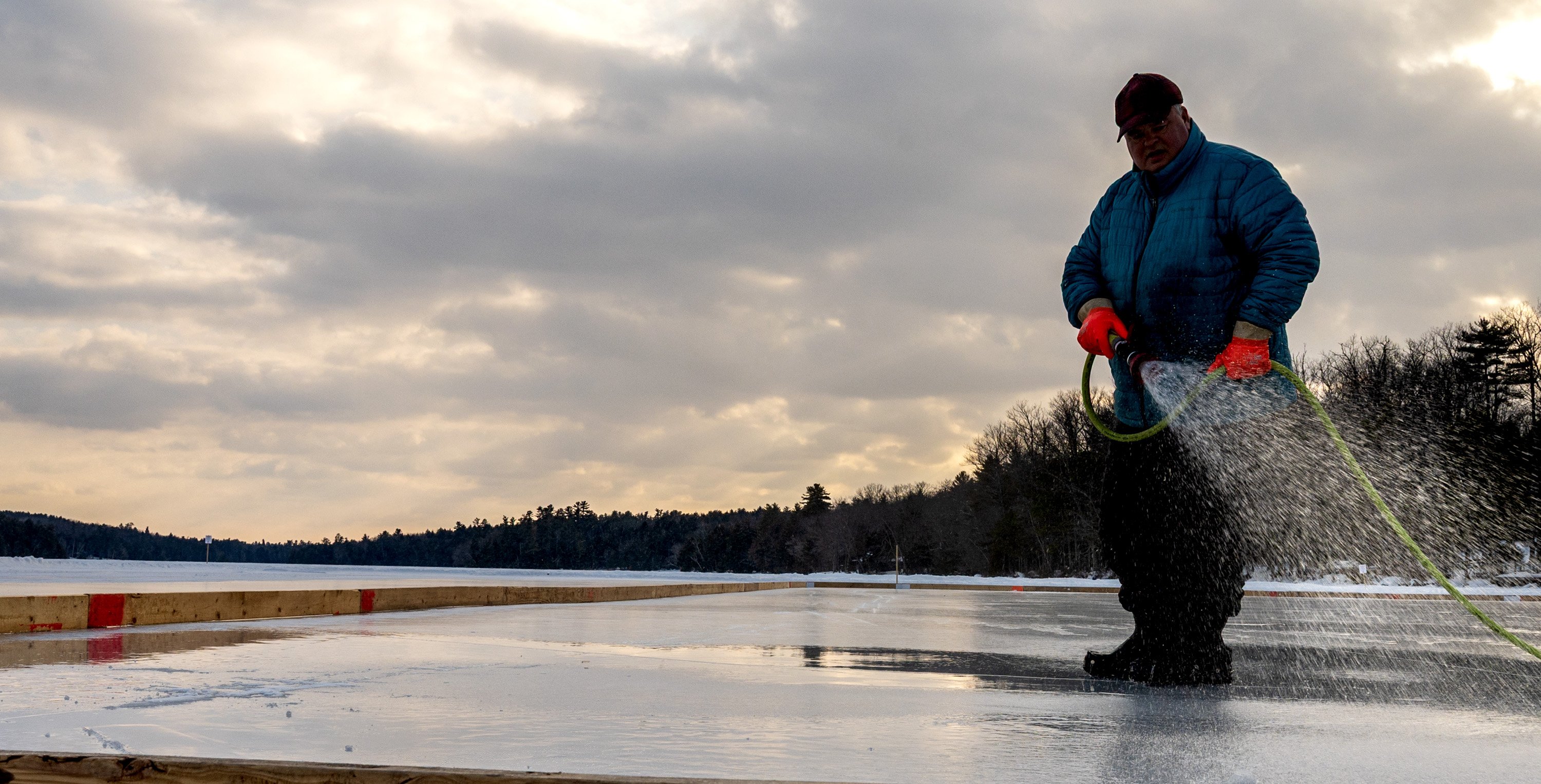 Bert Languet sprays water on a hockey rink Wednesday in Oakland. The rink is one of the nine surfaces being built for this weekend’s 14th Maine Pond Hockey Classic held for the first time on McGrath Pond at Camp Tracy. Approximately 500 players on 66 teams plan to compete. The annual event is a fundraiser for the Alfond Youth and Community Center in Waterville. The adult tournament is set for Friday through Sunday and a youth tournament is scheduled for Feb. 13-15. (Joe Phelan/Staff Photographer)