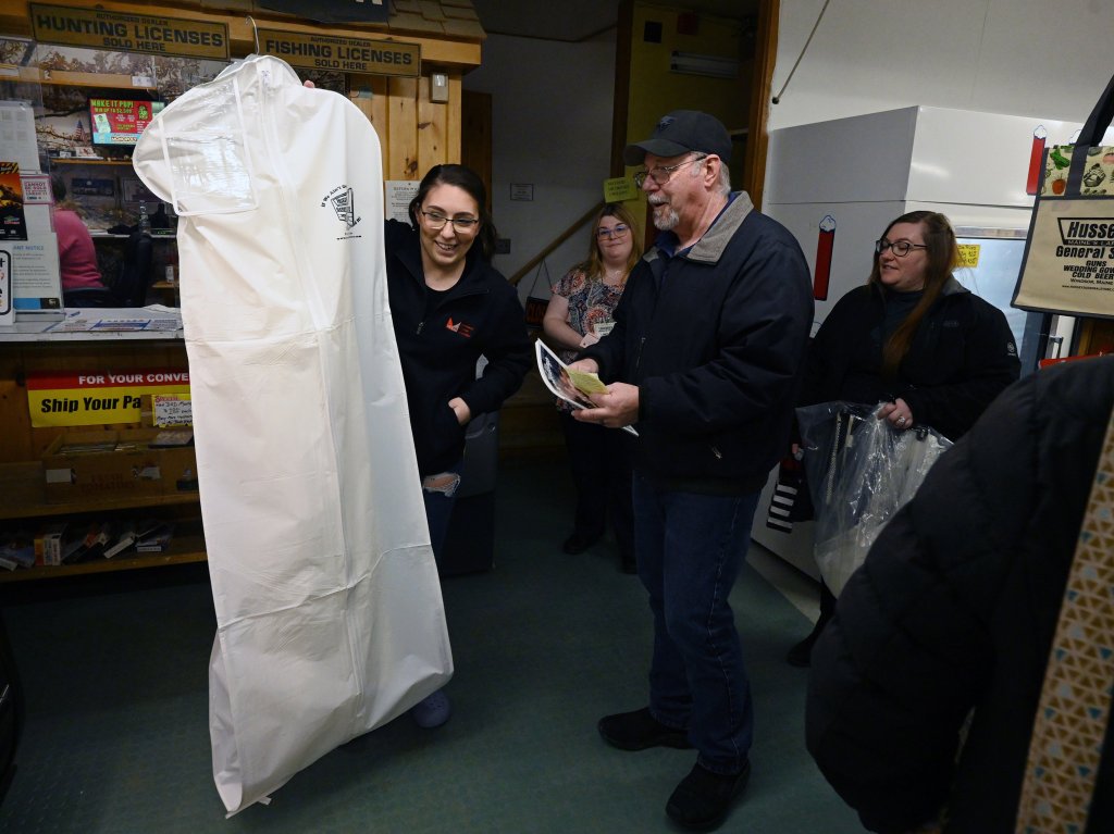 Signage at Hussey’s General Store highlights guns, wedding gowns and cold beer Jan. 25 in Windsor. The store was established in 1923.Kristen Ballantyne, left, and sister Lindsay Hannon remove a wedding gown from a garment bag Jan. 21.Beadwork adorns the bodice of a wedding gown held by Kristen Ballantyne at Hussey’s General Store.Slippers tailored for a bride and other accessories including veils, shoes and belts are sold in the bridal department.Jay Hussey and daughter Kristen Ballantyne stand beside department signs at the store. They represent two of the four generations that have owned and operated the store since 1923. (Rich Abrahamson/Staff Photographer)Hussey’s General Store bridal and clothing consultant Lindsay Hannon assists bride-to-be Sam Wiswell of Albion while selecting a wedding gown Jan. 25 at the store in Windsor. Wiswell tried on 18 gowns during the two-hour appointment. Attending the event, from left, are Ann White, grandmother of groom Cory Roy; and Wiswell’s mother, Michelle Wiswell, sister Adryenne DeRose, and father, Patrick Wiswell.Hussey’s General Store bridal and clothing consultant Lindsay Hannon offers a variety of gowns to bride-to-be Sam Wiswell of Albion.Bride-to-be Sam Wiswell tries on a veil while shopping for a wedding gown. Bride-to-be Sam Wiswell carries the wedding gown she purchased at Hussey’s General Store. With Sam is her father, Patrick Wiswell, center, and sister Adrienne DeRose, right. Lindsay Hannon, Hussey’s bridal and clothing consultant stands in the background.Bride-to-be Sam Wiswell exits the store while carrying the wedding gown she purchased. At left is Ann White, grandmother of the groom, Cory Roy. Her father, Patrick Wiswell, is in back.