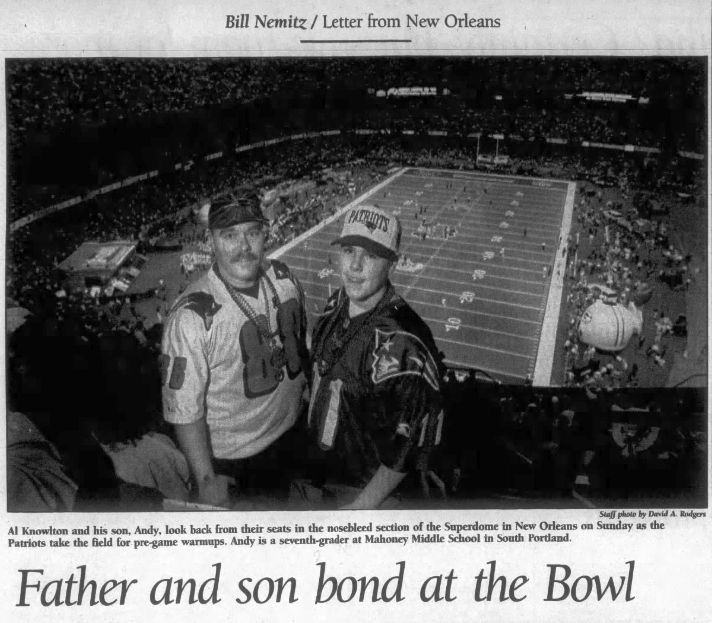 Mainers Al and Andy Knowlton were fortunate enough to score tickets to the New Orleans game. From the Portland Press Herald, Jan. 27, 1997. (Courtesy of Newspapers.com)